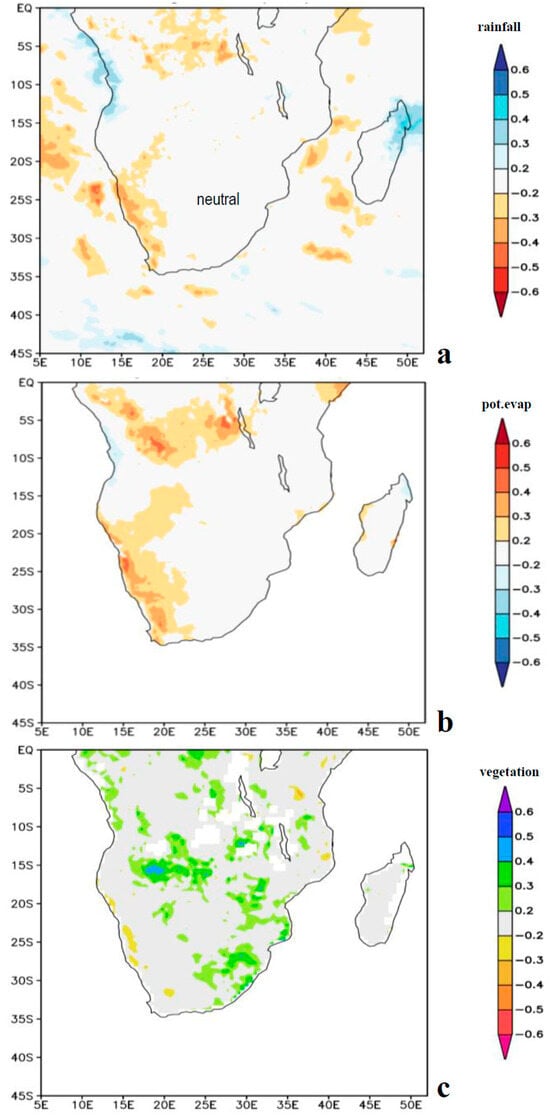 Southern Africa’s Dec–Mar point-to-field correlation maps with respect to PC-2 are presented in Figure 4a–c. Rainfall and potential evaporation show a weak signal: east Pacific La Niña corresponds with a drier Kalahari Desert. The crop-growing area (25–32° E) experiences a slightly positive influence on vegetation but no effect on the surface water balance (R ~ 0). PC-2 offers little benefit, unlike central Pacific PC-1 (cf. Appendix A, Figure A2), wherein strong correlations with rainfall, potential evaporation, and vegetation indicate surplus water balance (P > E). Past research has demonstrated a marked ENSO influence on the Southern African climate and crop production [45], albeit with multi-decadal instability [36]—here attributed to decoupling when the Pacific zonal dipole shifts eastward.