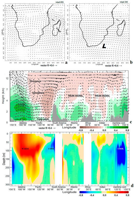 Correlation of Dec–Mar PC-2 time scores with Merra2: (a) 850 hPa winds and (b) 200 hPa winds over Southern Africa. PC-2 correlation with global equatorial: (c) atmospheric circulation (vectors) and humidity (shaded) and (d) subsurface sea temperature averaged 10° S–5° N. All refer to east Pacific La Niña conditions; vertical motion is exaggerated in (c).