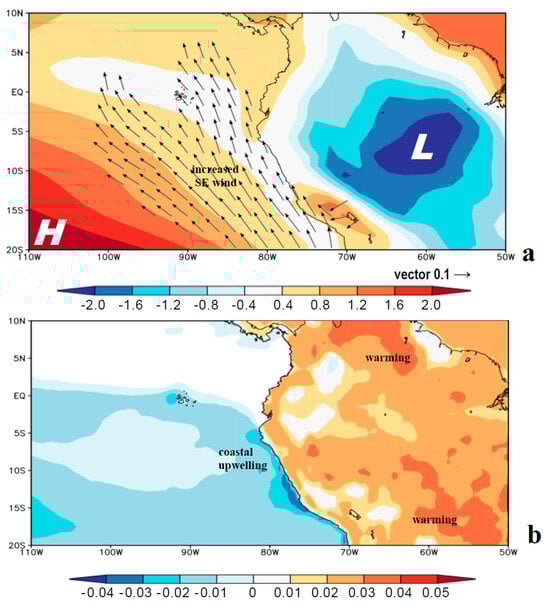 The east Pacific PC-2 time score contained an upward trend that may be associated with climate change. An independent analysis of trends in sea-level air pressure from the Hadley esm3 simulation scenario spanning 1980–2050 in 8.5 W/m2 (Figure 6a) shows an enhancement of the south Pacific marine anticyclone (+2 Pa/yr) and a thermal low over the Amazon (−2 Pa/yr). The pressure gradient accelerates SE winds and coastal upwelling off Peru, as South America warms under deforestation. The historical surface temperature trend from Merra2 reanalysis spanning 1980–2024 is −0.02 C/yr over marine areas and +0.02 C/yr over terrestrial areas (Figure 6b). A steric response underpins the land–sea pressure gradient that funnels equatorward winds over the tropical east Pacific, along the periphery of a thermal low over South America. These features correspond with an upward trend in PC-2 time score, and a tendency for more frequent and sustained La Niña conditions [29].