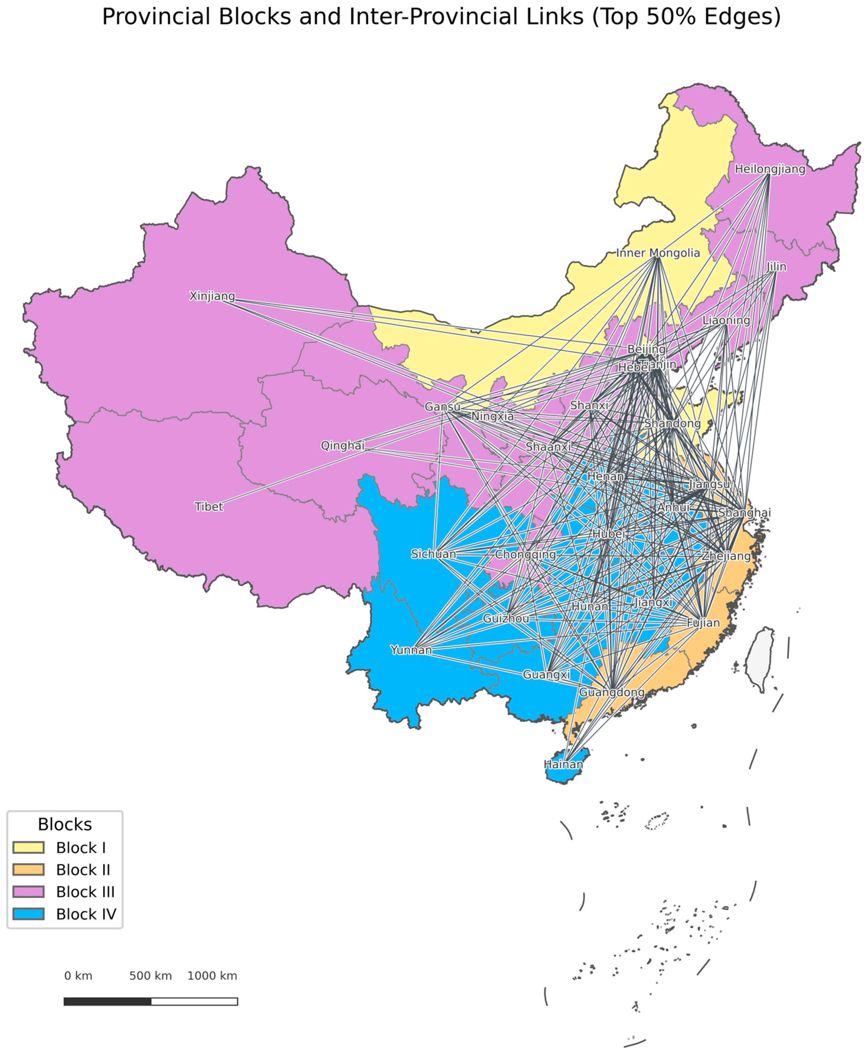 3.1.2. Community Structure and Block Characteristics of the Spatial Correlation Network: Roles and Relational Patterns