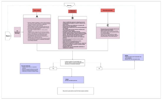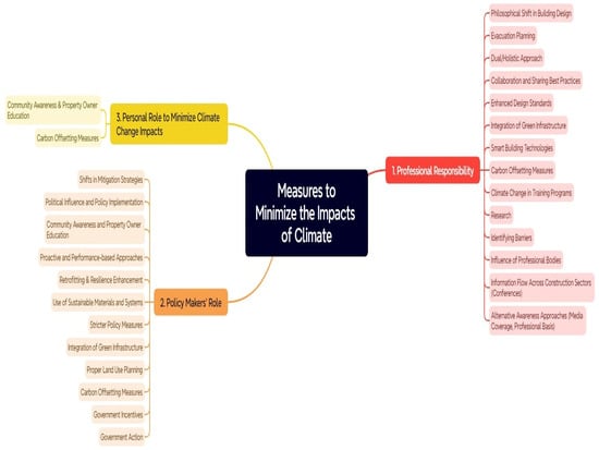 The respondents were asked to identify resilience and mitigation measures to minimise the impacts of climate change on residential buildings. Therefore, to better understand the measures, three roles were identified: personal role to minimise the impacts of climate change, professional responsibility, and policy makers’ role. The themes formed were classified as shown in Figure 1 below.