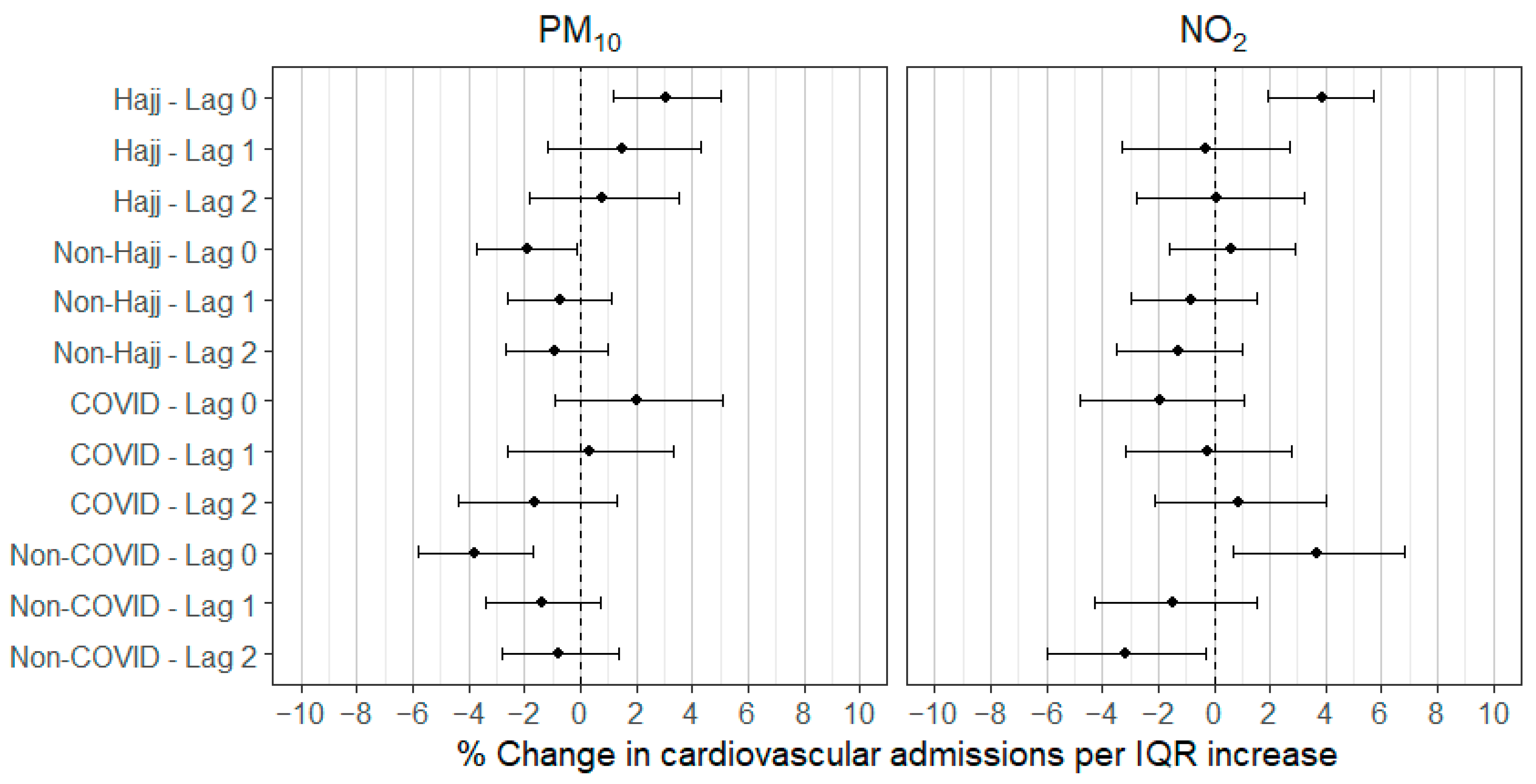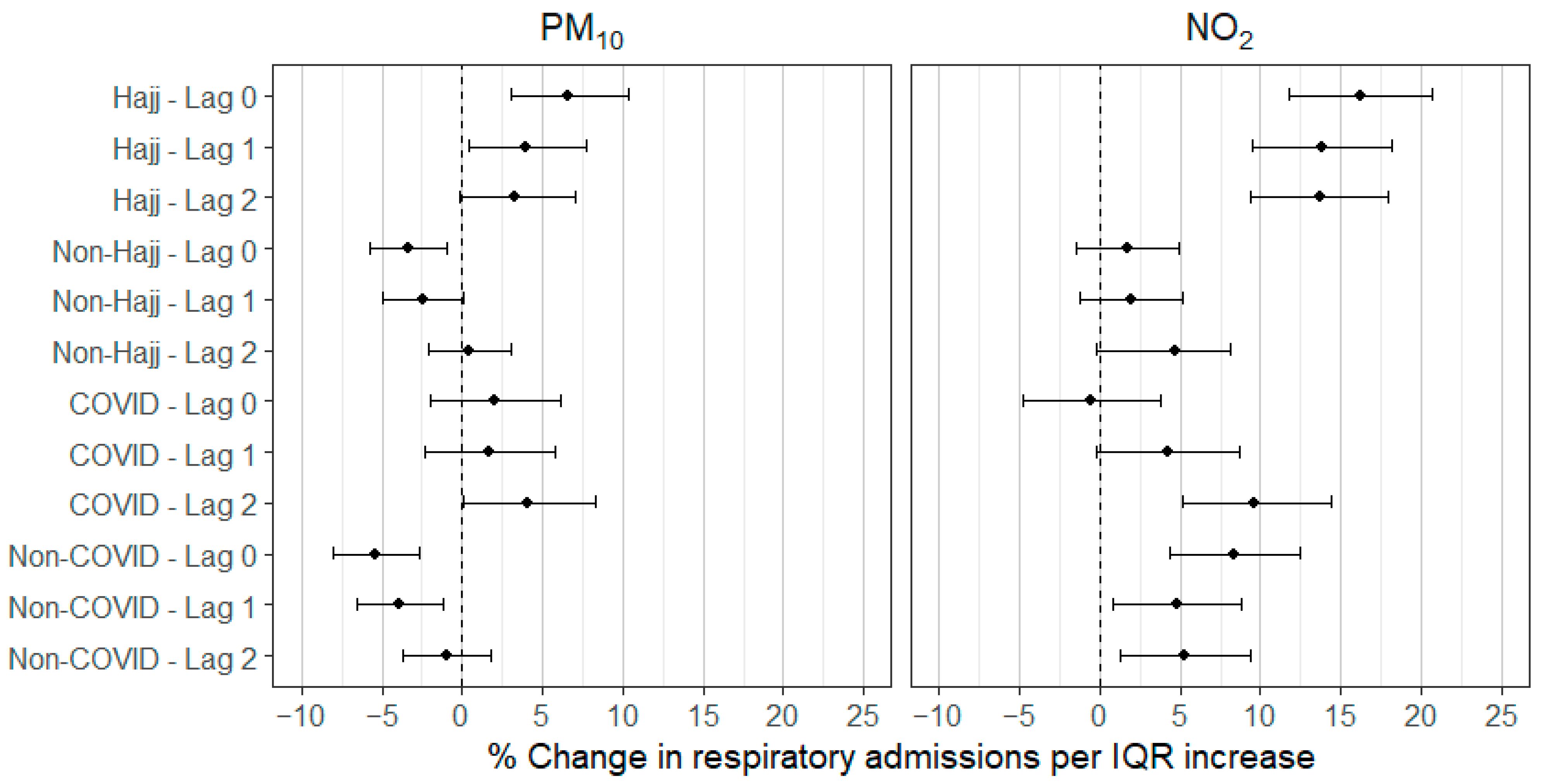 Chicago/Turabian StyleMilibari, Albaraa A., Ivan C. Hanigan, Hatim M. Badri, Wahaj A. Khan, and Krassi Rumchev. 2025. "Associations Between Air Pollution and Hospital Admissions for Cardiovascular and Respiratory Diseases in Makkah, Saudi Arabia, During the Hajj Cultural Events and the COVID-19 Outbreak" Atmosphere 16, no. 10: 1220. https://doi.org/10.3390/atmos16101220