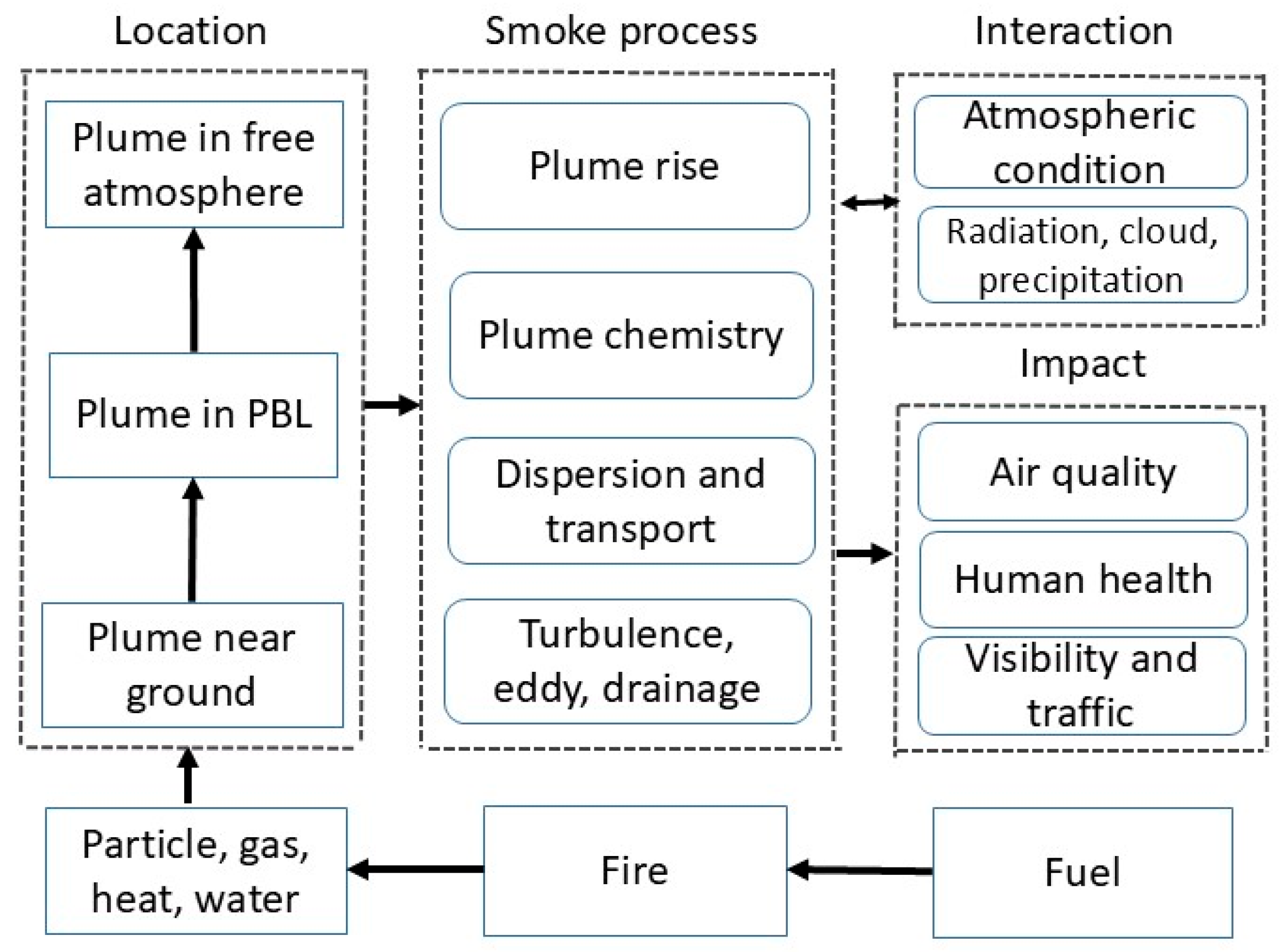 - Major gaps in smoke dynamics research exist and need to be filled to better address the challenges facing smoke dynamics research. Observational data across multiple times and spaces for large wildfires, plume vertical structure, and duff burning are needed to improve smoke modeling and prediction. There is a need to understand the differences in measured smoke properties between prescribed fire and wildfire. There is also a need for high-resolution, dynamic fire, smoke, and atmospheric-coupled systems, integrated systems of statistical, physical, and ML models, and the simultaneous measurements of these components for wildfires and WUI fires. It is important to develop “physics-informed” or “explainable AI” (XAI) models that respect physical laws, as ML techniques applicable in wildfire simulation are not only limited in data fitting, but have to consist of scientific content. Schemes are needed for vertical plume distributions and multiple updrafts. There is also a need to improve nighttime smoke modeling, smoke processes in Earth system models, and operational smoke prediction skills.