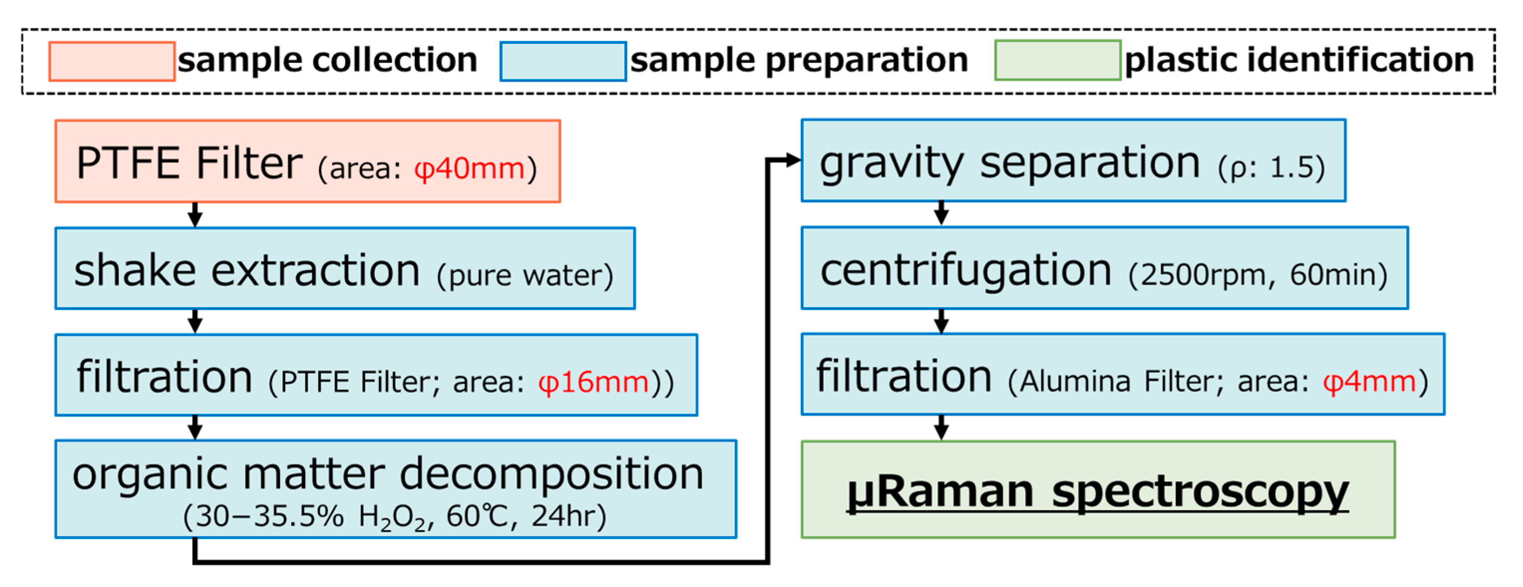 Samples were processed in a clean room to minimize contamination. Preparation followed a three-step procedure widely adopted in previous studies [5,17,28,47]: (i) organic matter removal by H2O2 treatment, (ii) density separation using NaI solution, and (iii) centrifugation. The final extracts were filtered onto alumina filters (φ25 mm, pore size 0.2 µm), concentrating the effective area to φ4 mm. The procedure was summarized in Figure 3. Appendix B.1.2 provides additional experimental details.