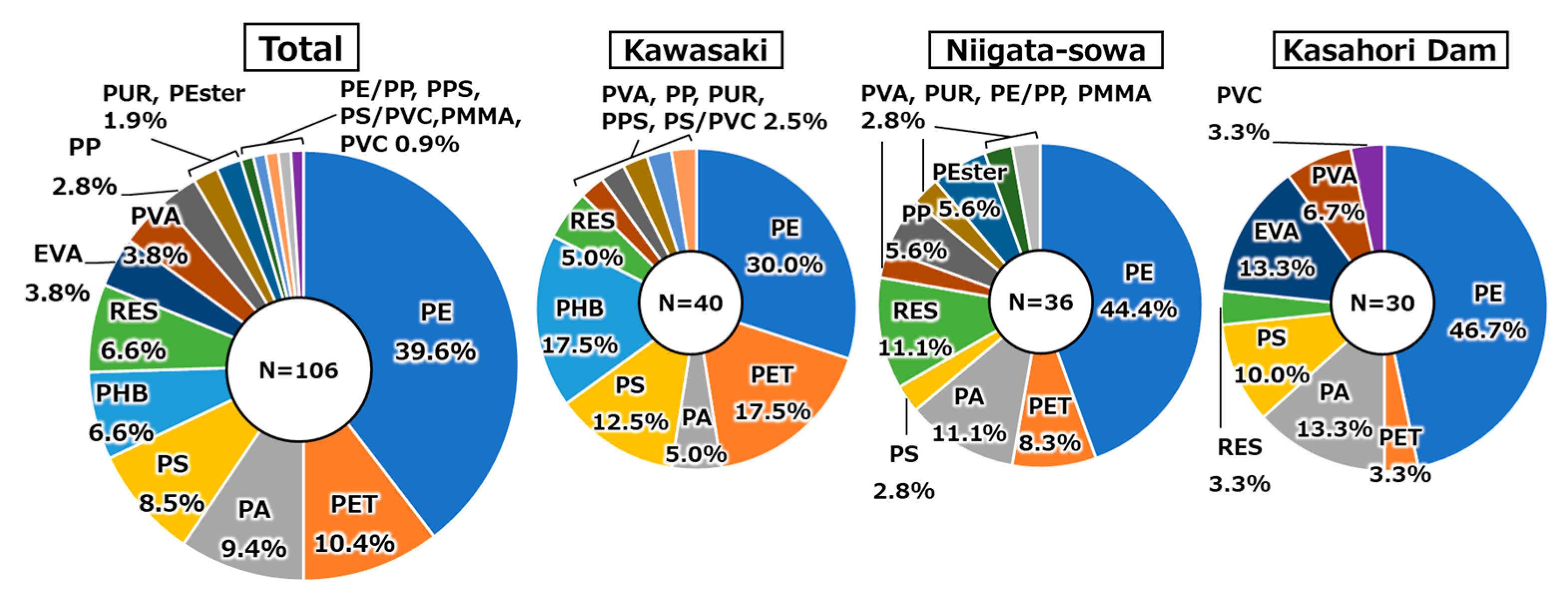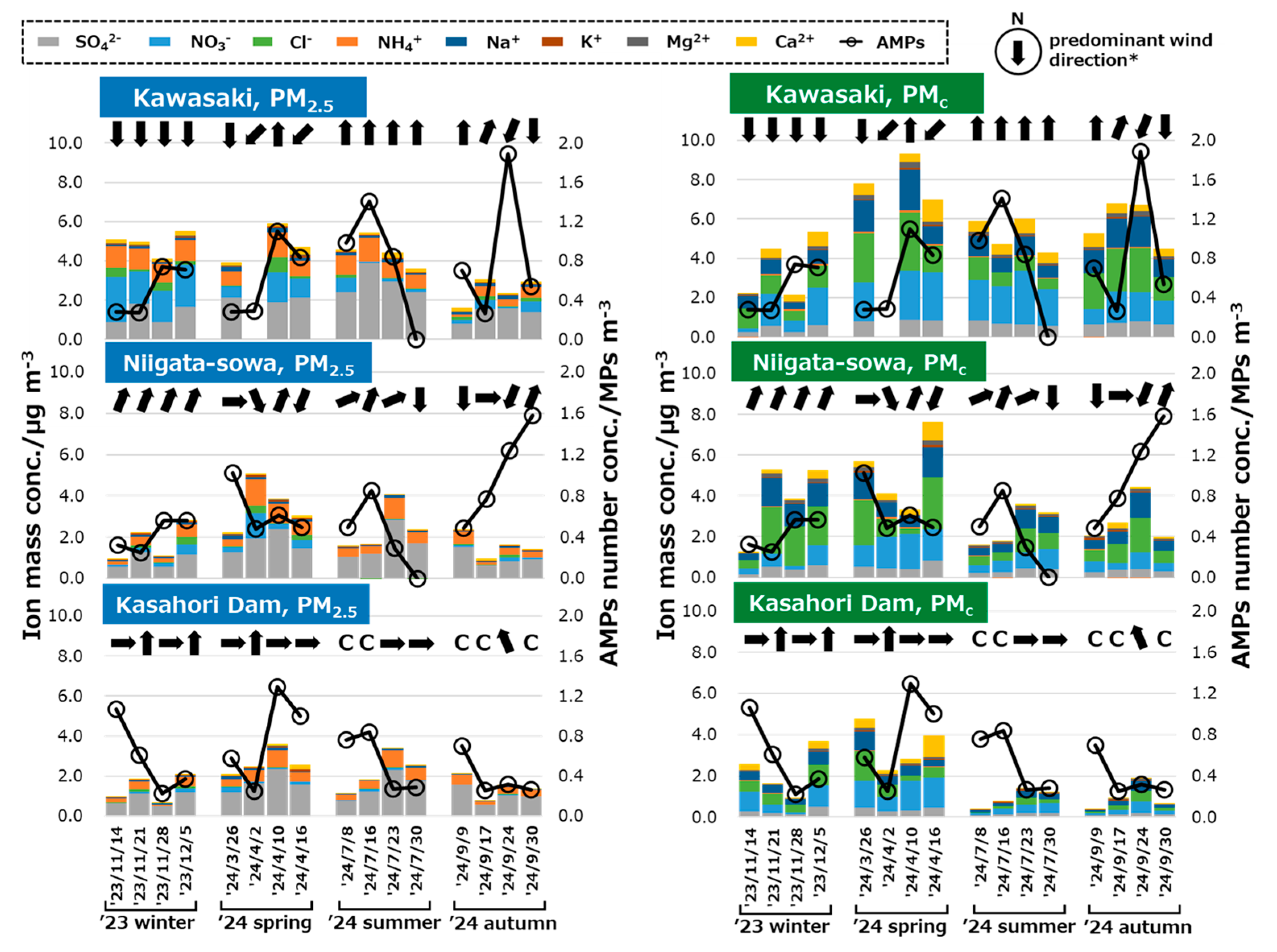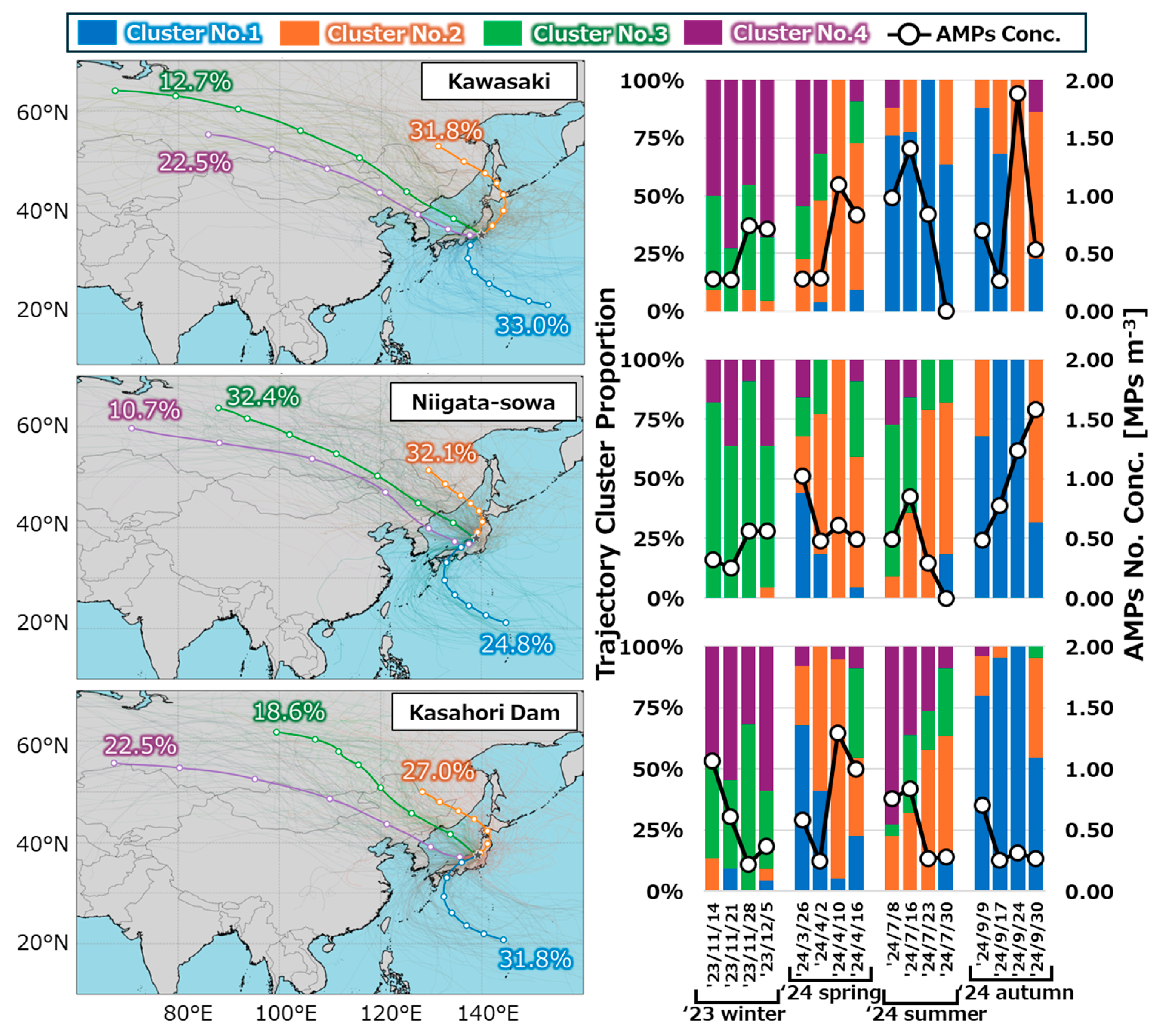 Considering the aforementioned background of research in this domain, this study presents the results of AMP measurements (e.g., number concentration, polymer type, and particle size) for each sampling site obtained using unified sample collection, preparation, and identification methods throughout the study. These measurements were based on seasonal intensive observations at multiple sampling sites in Japan, each of which exhibited distinctive characteristics. Furthermore, an attempt was made to obtain information that would contribute to the identification of the source of AMPs from the strength of correlation with each component of PM measured simultaneously, combining with comparison with meteorological data and backward trajectory analysis. The results of this study were reported in the following sections.
