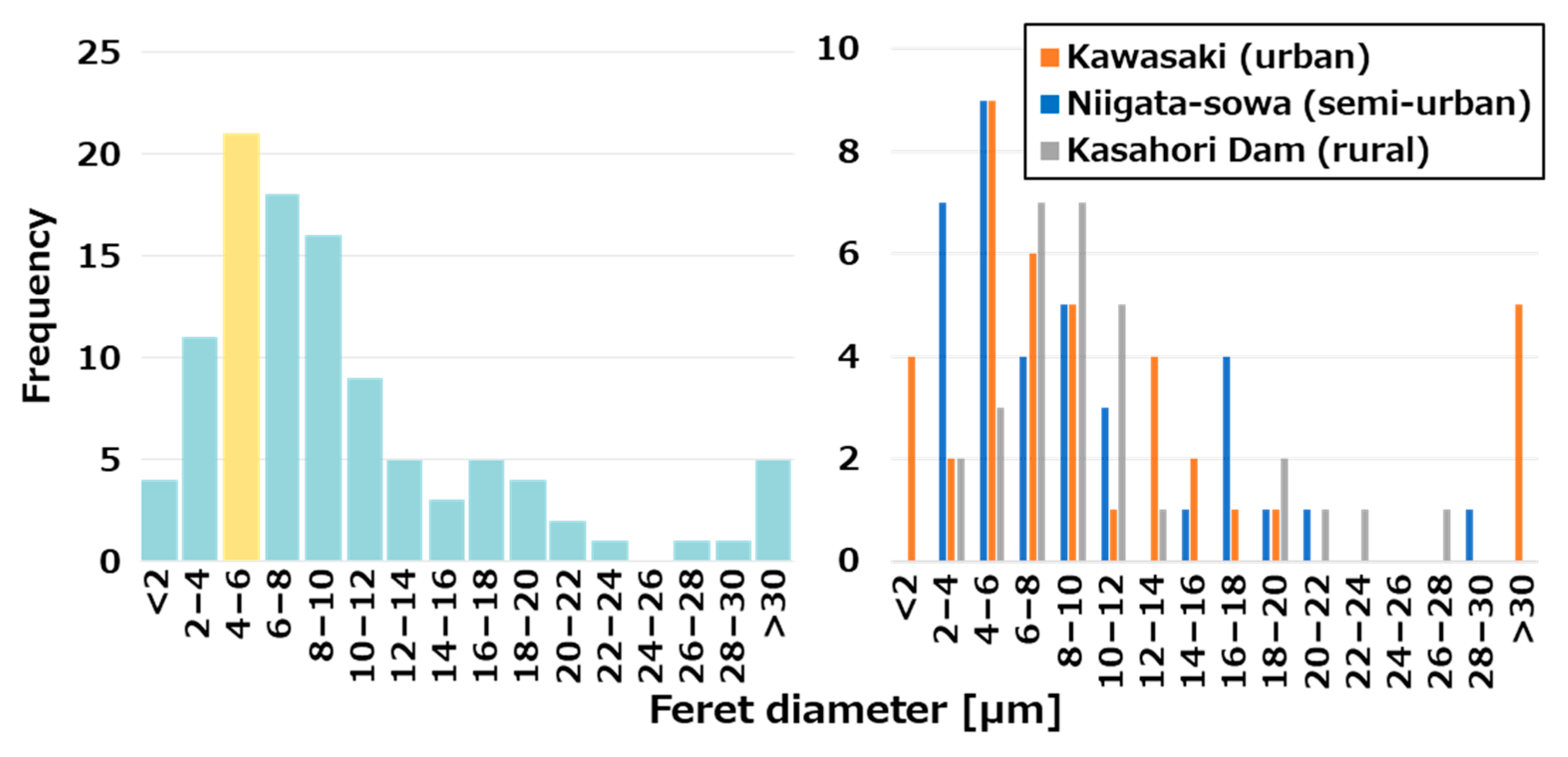 The mean Feret diameter was 10.9 ± 10.6 μm across all locations, 9.1 ± 6.2 μm in Niigata-sowa, 12.9 ± 15.2 μm in Kawasaki, and 10.5 ± 5.7 μm in Kasahori Dam, respectively. As illustrated in Figure 6, the histograms delineated the Feret diameter of AMPs for the total and individual sampling sites. A cross-site examination revealed that the most prevalent size class was 4–6 μm, with the tiny AMPs measuring below 10 μm constituting 66.0% (N = 70) of the total. Revell et al. reported a typical distribution between 15 and 250 μm under the various preparation and identification methods, which was larger than the particle size distribution in this study [33]. Conversely, Levermore et al. reported that the 5 to 10 μm class accounted for 52.5% and the 11 to 20 μm class accounted for 35.0% of the particles identified using μRaman for AMPs [67]. Likewise, Sasaki et al. reported a comparable tendency in their findings, noting that the mean of the calculated aerodynamic equivalent diameter of AMPs was 7.6 ± 3.7 μm [17]. These results both based on μRaman identification indicated a smaller particle size distribution, which was consistent with the present study. In general, the spatial resolution of μRaman is approximately 1 μm, which is sufficiently appropriate to capture tiny AMPs. Consequently, it was hypothesized that discrepancies in identification methodologies resulted in variations in the size distribution of particles between the studies. A comparison of the locations revealed divergent results for the most prevalent values, with Niigata-sowa and Kawasaki demonstrating 4–6 μm, while Kasahori Dam exhibited 6–8 μm and 8–10 μm. Furthermore, Kawasaki exhibited a relatively broad particle size distribution, ranging from 1.4 to 79.8 µm, with the smallest particle size being 1.4 µm, which approaches the detection limit of μRaman. In addition, particles larger than 30 µm, which were not detected in the other two locations, were confirmed. The observed discrepancy in the size distribution of particles can be attributed to variations in environmental conditions across different locations. It was suggested that these cross-site variations were particularly attributable to the generation from the source and the processes of micro-fragmentation induced by subsequent degradation of AMPs, while the limited number of samples made it difficult to draw clear conclusions.