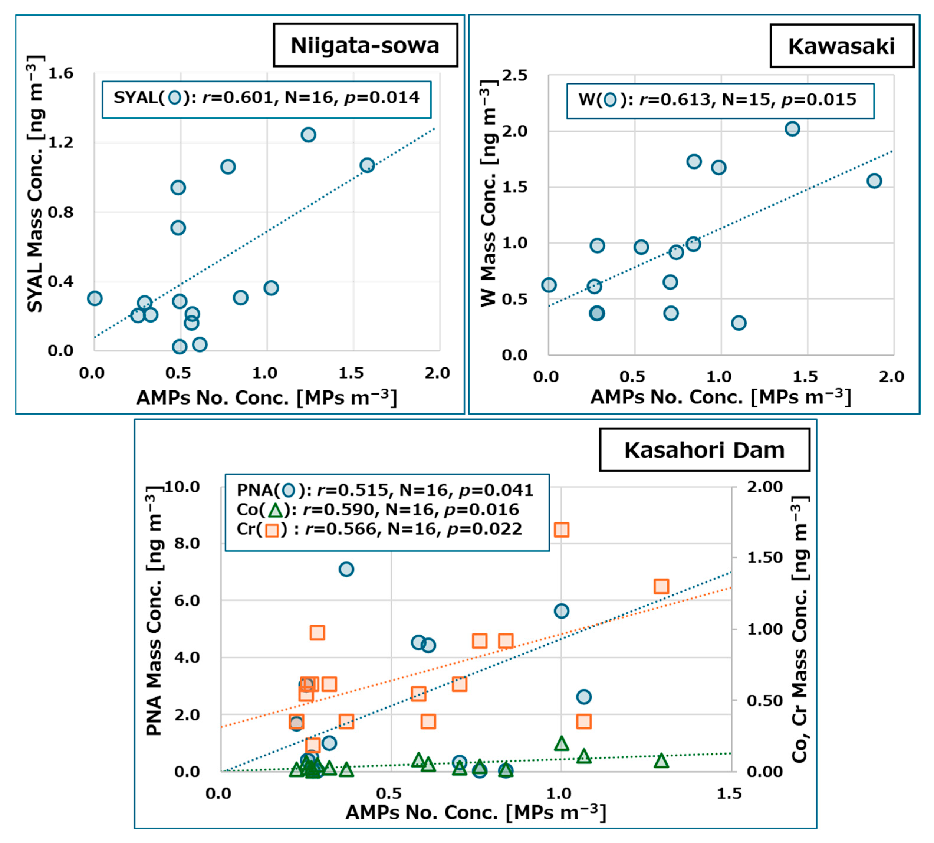 Table 2 presents the annual average values of the AMP number concentrations and the total ion mass concentrations of PM2.5 and PMc for each sampling site. As stated in the previous studies, soluble inorganic ions have been found to comprise as much as 60–70% of the total mass of suspended particulate matter [64], and 30–50% of the total PM2.5 mass [65,66]. Given that ion components are widely regarded as the predominant constituents of PM, ion mass concentrations were utilized as metrics to comparatively analyze AMPs and PM. A comparison with the results of previous studies that also employed the active sampling method revealed that the AMPs number concentrations ranged from 0.01 to 5650 MP m−3 (N = 13, median: 2.9 MP m−3) [12,14,26,33,38,54,67,68,69,70]. Notably, the results for all three locations fell within this range, indicating a consistency in the findings across different study sites. Focusing on the comparison of concentrations between PM and AMPs, the concentrations were Kawasaki, Niigata-sowa, and Kasahori Dam in descending order, a commonality observed across all three items (i.e., AMPs, PM2.5, and PMc). While the concentration differences among the three sites proved to be statistically significant for both PM2.5 and PMc (N = 15 for Kawasaki, N = 16 for the other two sites, p < 0.05), no significant differences were detected in the AMPs number concentration (N = 16 each, p > 0.05). Weekly fluctuations of AMPs number concentrations, ion mass concentrations of PM2.5/PMc, and the predominant wind directions at each sampling site were delineated in Figure A3. Although seasonal fluctuation was observed, PM2.5 tended to have a relatively high proportion of SO42− and NH4, while PMc tended to have a relatively high proportion of Cl, Na+, and Ca2+ regardless of the locations, which is consistent with previous studies [58,64,65,66]. However, no clear correlation was observed between total ion mass concentration of PM2.5/PMc and AMP number concentration at any location. According to the Japan Meteorological Agency, dust and sandstorms (DSS) originating from mainland China were observed during 5–12 December 2023 and 16–23 April 2024, respectively [71]. While the PMc mass concentration of Ca2+, which is known as part of the major components of DSS, was relatively elevated at three sampling sites, there was no significant increase in the number concentration of AMPs during both periods.