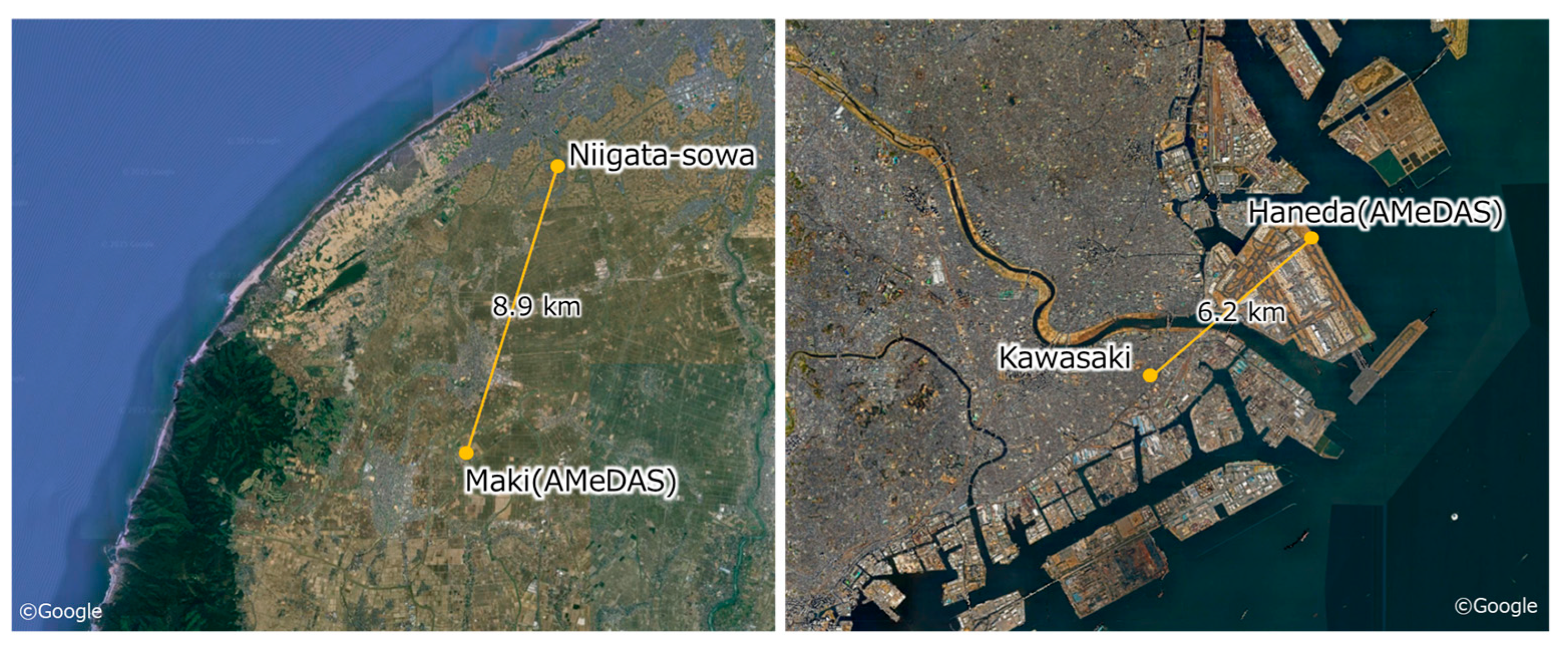 Simple Pearson regression analyses to evaluate the linear relationship were performed for each location, with the number concentration of AMPs serving as the response variable and the PM2.5 components and meteorological parameters (i.e., averaged wind speed, maximum instantaneous wind speed, and averaged precipitation) serving as the explanatory variables. Consequently, the explanatory variables employed in this study amounted to 52, encompassing PM2.5 components and meteorological parameters. The rationale behind the exclusive focus on PM2.5 as a target for PM tracer components was elucidated in Section 2.1.2. The meteorological data from the nearest stations (AMeDAS) whose data were available to the sampling sites were used for analysis [59]. However, in the case of Kasahori Dam, meteorological instruments were installed at the sampling site, and the data from these instruments were utilized. Satellite images which delineate Niigata-sowa and Kawasaki as well as the nearest AMeDAS to each of the sampling sites, namely Maki and Haneda, are shown in Figure A1.