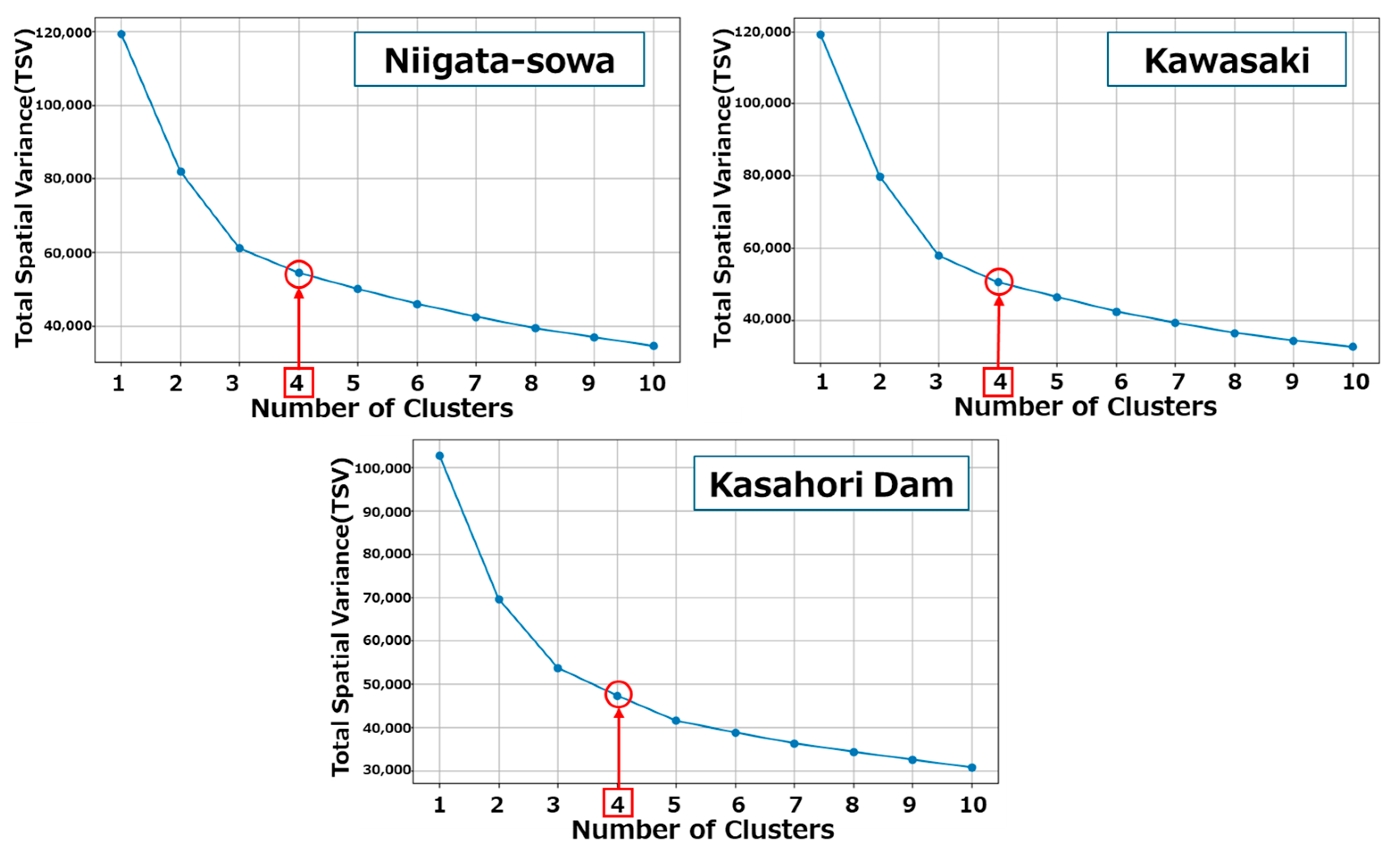 The calculation of back trajectories was performed using meteorological data (CFSv2, time resolution: 3 h, spatial resolution: 0.5 × 0.5 degree) from the National Centers for Environmental Prediction (NCEP) via the online software METEX [60,61]. The trajectories were calculated at 8-h intervals under the 3D-wind (kinematic) mode, with a 7-day trajectory length from the receptor sites, corresponding to three sampling sites delineated in Section 2.1.1. The altitude of all the receptor sites was set at 500 m. Although the temporal resolution of the METEX trajectories may be relatively coarse, the purpose of this study was not to interpret individual trajectories in detail but to capture representative transport patterns at a regional scale. By applying cluster analysis, the uncertainties of individual trajectories are averaged out, allowing for the analysis of large-scale horizontal transport pathways. The following procedures for trajectory clustering, including preprocessing the output csv files from METEX and ratio aggregation, were implemented in Python (v3.11) and executed in Google Colab. The trajectories of each receptor site were allocated to discrete clusters in accordance with their velocity and trajectory, employing Ward’s hierarchical method, which is predicated on the Euclidean distance between all possible pairs of trajectories. This clustering approach was applied to group similar trajectories into representative patterns, thereby reducing noise from individual trajectory uncertainties and highlighting large-scale transport features. Ward’s hierarchical method was selected because it minimizes within-cluster variance and has been widely applied in trajectory studies for regional-scale source identification [16,62,63]. The representativeness of each cluster facilitates the interpretation of long-range transport pathways and their potential influence on receptor sites, rather than focusing on single trajectories that may be affected by model uncertainty. The outcomes of the hierarchical clustering algorithm are contingent upon the number of clusters. In this study, the final number of clusters at all receptor sites was determined to be four, based on the variation of total spatial variance (TSV) with cluster numbers (see Figure A2).