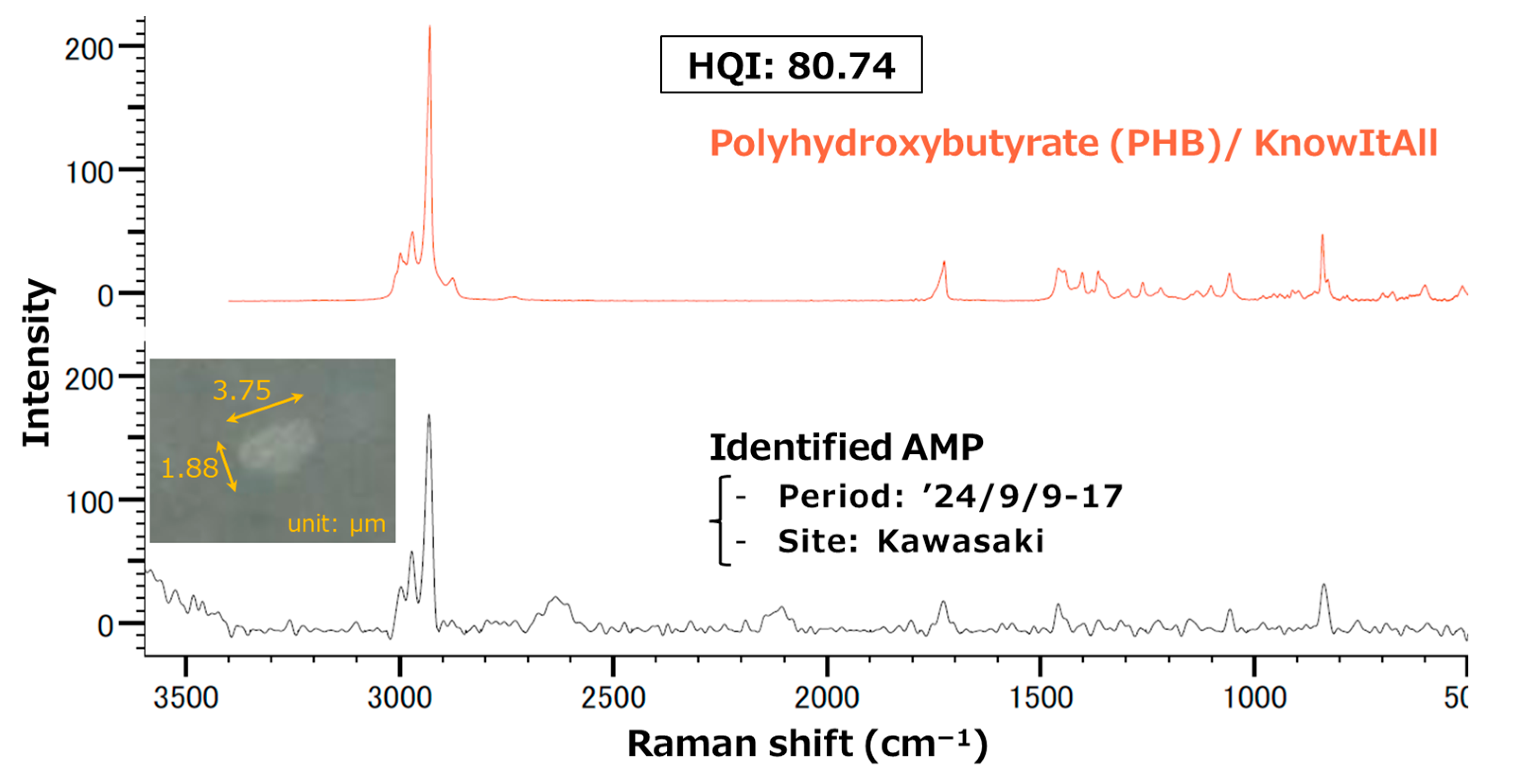 An analysis of each location reveals the predominance of PET and PHB in Kawasaki, RES in Niigata-sowa, and EVA in Kasahori, respectively. According to the findings of a preceding study, PET had been demonstrated to comprise a substantial percentage of MPs in urban dust at major cities in China [25]. In this study, the proportion of PET was highest in Kawasaki (17.5%), which exhibits the strongest urban characteristics among the three sampling sites, followed by Niigata-sowa (8.3%) and Kasahori Dam (3.3%). Consequently, it was suggested that the proportion of PET could be influenced by the extent to which the given location exhibits characteristics of an urban environment. Regarding PHB, to the best of our knowledge, this study is the first to report detecting PHB as AMP. Figure A4 delineated Raman spectra of polyhydroxybutyrate (PHB) from the KnowItAll library (orange, top row) and the identified AMP (black, bottom row), along with an actual field-of-view image of the AMP. PHB is classified as a type of biodegradable plastic that has garnered attention as a potential substitute for conventional non-biodegradable plastics [76]. The preceding study demonstrated that the half-life of a film of PHB with a thickness of 85 μm on the seafloor ranged from 54 days to 1247 days, while no degradation was observed for a low-density PE film under the same condition [77]. However, previous experiments simulating real environments confirmed that primary PHB particles underwent abiotic degradation to produce secondary MPs, which had a negative impact on water organisms [78]. In light of these findings and considerations, it was suggested that secondary MPs may be dispersed into the atmosphere as a result of PHB degradation in the ocean or other environments. It is also noteworthy that PHB detection was limited to Kawasaki. While there is a possibility that this discrepancy may be indicative of variations in environmental conditions, a definitive correlation with meteorological factors (i.e., averaged wind speed, maximum instantaneous wind speed, and averaged precipitation) remains elusive. RES, which is referring to epoxy and phenoxy resins, has been widely used for coatings, electronic materials, adhesives, and matrices for fiber-reinforced composites [79]. EVA has been widely used in the footwear industry for insoles, midsoles, and outsoles as well as in the wire and cable industry for heat shrinkable insulation, semi-conductive jackets, and flame-retardant coatings [80,81]. Given the general-purpose nature of both polymers, it is challenging to ascertain the origin of AMPs. Although it is noteworthy that EVA was detected exclusively at Kasahori Dam, correlations with the aforementioned meteorological factors were not significant (p > 0.05).