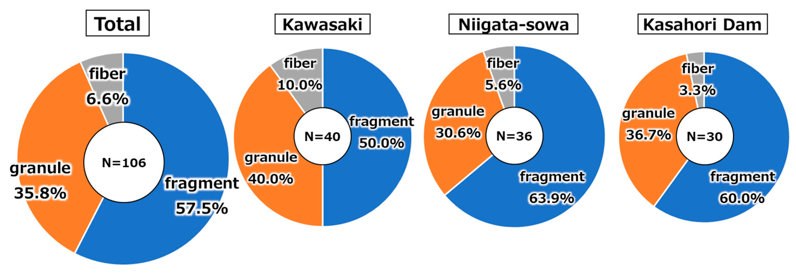 Breakdowns of AMP morphologies (fragment, granule and fiber) for the total and individual sampling sites were presented in Figure A5. The distinction between fragments, granules, and fibers was made according to the definition of aspect ratio shown in Section 2.2.2. A cross-site analysis revealed that fragmented AMPs were the most prevalent (57.5%), followed by granular (35.8%) and fibrous AMPs (6.6%). This tendency was observed in each of the three locations: Kawasaki, Niigata-sowa, and Kasahori Dam. The results of this study indicated minimal variation in the morphology of AMPs across different locations, suggesting that other factors may be more significant in determining their characteristics. Previous AMPs studies have broadly classified these into two categories: those with a high proportion of fibers [25,27,69] and those with a high proportion of particles and fragments [13,17,38,82]. It was pointed out that this tendency may be contingent upon the preparation method utilized, in particular, some previous studies demonstrated that particles and fragments prevail when employing both the organic decomposition and the heavy liquid (gravity) separation methods adopted in this study [17]. Consequently, the necessity to establish a unified measurement method for AMPs has been underscored, as the shape tendency may undergo alteration contingent upon the preparation methods.