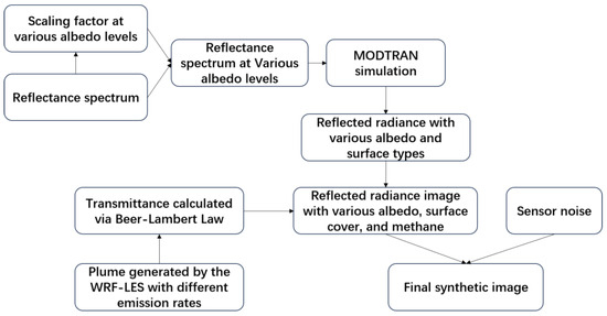 To isolate algorithm performance from confounding surface types and albedos, we employ synthetic hyperspectral imagery as the gold standard for intercomparison. This study’s synthetic imagery covers eight distinct surface types that are modeled at two surface albedos. The framework can be seen in Figure 1, and details of the simulations can be found in Section 2.2, Section 2.3 and Section 2.4.