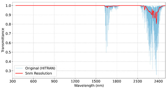 Top-of-atmosphere transmission spectra simulations at various spectral resolutions (full-width half maximum, or FWHM). High-resolution spectra simulated using the HITRAN Application Programming Interface tool (v1.4) [44] (indicated by the blue color), and sampled spectra with a spectral resolution of 5 nm (AVIRIS-NG) (indicated by the red color).