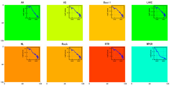 A sample of the simulated synthetic datasets for different surface types at an albedo of 0.4 without plumes. The small graph in the upper right corner of each subgraph represents the radiance curve of 2122–2485 nm.