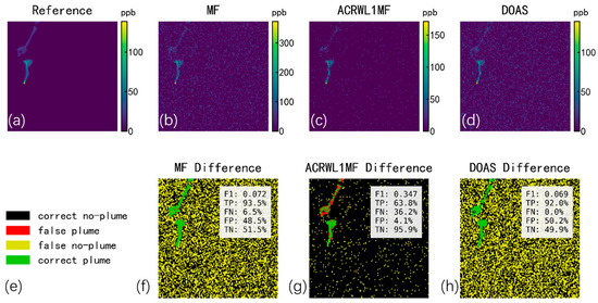 Comparison of retrieval results. (a) Simulated plume at 03:30:30 (emission rate: 500 kg/h; albedo: 0.4; land surface type: AH). (b) MF retrieval result. (c) ACRWL1MF retrieval result. (d) DOAS retrieval result. (e) Color scheme for TP/FP/TN/FN metrics. (f) MF retrieval vs. actual plume (legend: F1\TP\FN\FP\TN). (g) ACRWL1MF retrieval vs. actual plume. (h) DOAS retrieval vs. actual plume.