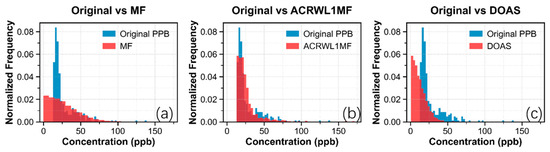 We further quantitatively evaluate the accuracy of the retrieved concentration distribution (Figure 7). We can see that the results retrieved using ACRWL1MF are relatively consistent with the reference plume. The results retrieved using MF and DOAS have lower values in their distributions.
