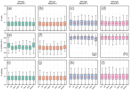 ACRWL1MF has a significant reduction in F1 (from about 0.8 to about 0.4) from high emission rate (1000 kg/h) to a lower emission rate (500 kg/h). Compared to the results at albedo of 0.2, MF-retrieved results at albedo of 0.4 have a significant difference between emission rates of 500 kg/h and 1000 kg/h (p = 0.00025). However, DOAS-retrieved results have no significant difference between emission rates of 500 kg/h and 1000 kg/h (p > 0.05). These results demonstrate that the three algorithms’ emission rate sensitivity varied: Both surface albedo and emission rates affected the ACRWL1MF method’s ability to detect plumes, whereas the DOAS method was not affected by either of these factors. At higher emission rates, surface albedo primarily affected the MF method’s ability to detect plumes.