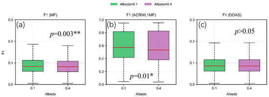 Comparison of F1 scores among algorithms under varying albedo conditions. (a) MF retrieval: albedo 0.1 vs. 0.4; (b) ACRWL1MF retrieval: albedo 0.1 vs. 0.4; (c) DOAS retrieval: albedo 0.1 vs. 0.4. The Mann–Whitney U test was used to conduct a significance test of difference to compare the two groups’ data. * and ** represent a significance level of 0.05 and 0.01, respectively.