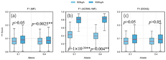 Comparison of F1 scores among algorithms under varying emission rates. (a) MF retrieval: albedo 0.1 vs. 0.4; (b) ACRWL1MF retrieval: albedo 0.1 vs. 0.4; (c) DOAS retrieval: albedo 0.1 vs. 0.4. The Mann–Whitney U test was used to conduct a significance test of difference to compare the two groups’ data. ** represent a significance level of 0.05 and 0.01, respectively.