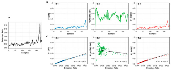 Curves of the proportion of plume-containing pixels for different samples from the simulated plume at 03:30:30 (emission rate: 500 kg/h; albedo: 0.4; land surface type: AH). (A) Ratio of plume-containing pixels to total pixels in the actual image. (B) F1 scores of different algorithms (B-1: MF; B-2: ACRWL1MF; B-3: DOAS). (C) Relationship between F1 score and actual plume pixel ratio (C-1: MF; C-2: ACRWL1MF; C-3: DOAS). R2 values are shown in each panel.