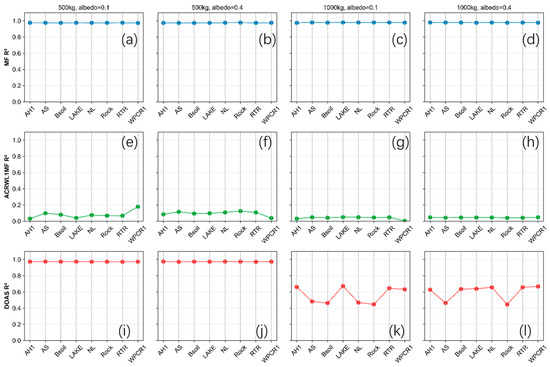 The R2 value of the relationship between the F1 of different algorithms and the proportion of actual plume pixels. Line 1: The R2 for the ratio of MF inversion results to actual plume flow pixels ((a,e,i) 500 kg h−1, albedo 0.1); (b,f,j) 500 kg h−1 albedo 0.4; (c,g,k) 1000 kg h−1, albedo 0.1; (d,h,l) 1000 kg h−1, reflectivity 0.4). The middle line shows the R2 for the ratio of ACRWL1MF inversion results to actual plume flow pixels. The last line shows the R2 of the ratio of DOAS inversion results to actual plume flow pixels. The vegetation types are displayed on the x-axis. All subgraphs share a common line color.