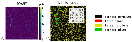 Comparison of retrieval results. (a) DRAMF retrieval result. (b) DRAMF retrieval vs. actual plume (legend: F1\TP\FN\FP\TN).