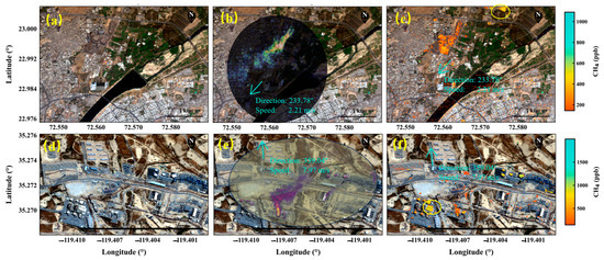 However, the locally high concentration signals in the rooftop areas of Figure 14c,f marked by yellow ellipses may be influenced by surface reflection artifacts. The localized high concentrations in Figure 14c,f are likely surface artifacts. While industrial rooftop ventilation systems are common emission sources in the region, analysis of the concentration time series from adjacent pixels showed no spatial gradient—consistent with random surface artifacts rather than a true emission plume. Although the rooftop signal in Figure 14c,f may be an artifact, not a real emission, and does not conflict with the literature conclusions. Subsequent analysis will use high-resolution land cover data (e.g., high-resolution imagery from Google Earth) to eliminate misinterpretations in non-plume areas, and quantitative analysis will be conducted only for areas with clearly defined plume patterns.