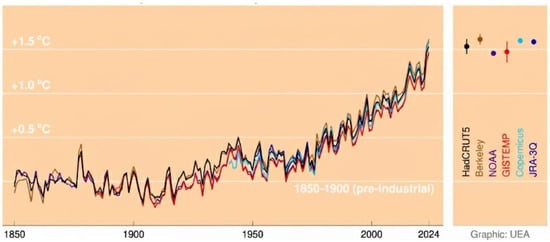During the first quarter of the 21st century, population growth, unplanned urbanization, land use, agricultural activities, technological advancements, and the energy expended for all of these activities have led to the absorption of all waste and residue into the atmosphere in gaseous form. As a result, the chemical structure of the troposphere began to change, and short-wave extraterrestrial radiation became unable to escape back into the atmosphere. Consequently, the accumulation of various gases, particularly carbon dioxide, has led to warming in the troposphere. The IPCC’s fourth and fifth assessment reports [1,2] explain in detail how these emissions contribute to global warming. The terms global warming and climate change are used interchangeably for the average temperature increase in the Earth’s climate system. According to the IPCC’s fifth assessment report [2], scientists are more than 95% confident that global warming is the result of greenhouse gas emissions caused by various human-related activities. It is also stated that in the 21st century, even if emissions are kept at their lowest limits, the global surface temperature is expected to increase by an additional 0.3 to 1.7 °C. The maximum increase limits are predicted to be between 2.6 and 4.8 °C. A study of the Climatic Research Unit (CRU) at East Anglia University examining temperature anomalies since 1850 showed that 2024 is the hottest year on record (Figure 1). Various research teams have used different methods with multiple datasets to estimate global temperature change from millions of individual temperature records, but all come to an agreement that 2024 was the warmest year on record. The fact that different datasets and methodologies (HadCRUT5, Berkeley, NOAA, GISTEMP, Copernicus, JRA-3Q) yield similar results shows that the results are not sensitive to a particular method. Although the outputs of different teams (Figure 1) show slight differences (usually the GisTEMP curve is at the bottom and the Berkeley curve is at the top), the common result of all is a noticeable linear trend, specifically after 1980 [3,4].