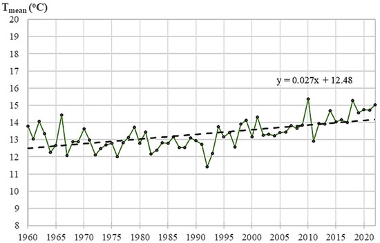 There have been studies in the literature on the changes in temperatures in Türkiye. These include trend analyses and estimations based on climate scenarios. The data taken into consideration are station observations in some studies and reanalysis datasets in others. To give examples of these studies, in a comprehensive study conducted in the early 2000s based on temperature observations covering the period 1929–1999 [77], mean, maximum, and minimum temperatures were examined and temperature increases were detected in 13% of the mean, 30% of the maximum, and 57% of the minimum annual temperature series. The Turkish State Meteorological Service [78] developed climate predictions with three different global models for 2016–2099 in order to estimate the future effects of climate change on the country. In the study, three global model datasets were used and dynamic downscaling method was used with the regional RegCM4.3.4 model and projection results were obtained for Türkiye with 20 km resolution for the future periods 2016–2040, 2041–2070, and 2071–2099 according to RCP4.5 and RCP8.5 scenarios with 1971–2000 reference period. According to the RCP4.5 scenarios, annual average temperatures are expected to increase by 1.4 °C on average in the first half of the century and by 2.2 °C on average in the second half of the century. According to the RCP8.5 scenarios, annual average temperatures are projected to increase by 1.7 °C on average in the first half of the century and by 3.8 °C on average in the second half of the century. In a more recent study, Ref. [79] worked with reanalyzed datasets of mean annual temperatures covering the period 1901–2014 and detected an increasing trend in almost all of the 81 stations (except Bingöl, Diyarbakır, and Erzurum). Our station-based observations of a ~1.6 °C increase since 1960 (0.027 °C/year × 60 years) are consistent with reanalysis datasets for the region [79] and fall within the range of early 21st century projections made by (MGM) for the RCP4.5 scenario, providing observational validation for these models. Ref. [79] used the Climate Research Unit Time Series (CRU TS V3.23) dataset (1901–2014) and temperature trend was analyzed with the Mann–Kendall test. In 79 of 81 stations (98%) of Türkiye, mean annual temperatures showed a significant increasing trend. In the future projections made by ref. [78] according to different climate scenarios, an increase in average temperatures is predicted for all of Türkiye’s provinces (100%), even in the optimistic scenario (RCP4.5). Another recent study [20] investigated annual mean temperature trends over the 50-year period (1969–2018). According to the study results based on geographical regions, an increasing trend was detected at 96% of the stations. The temperature increase slope varies from one region to another and remains between 0.030 °C and 0.035 °C annually. Ref. [80] investigated the effects of climate change on temperature in the Eastern Black Sea region of Türkiye. For the RCP8.5 scenarios an increase of 0.035 °C/year in the interior and 0.03 °C/year in the coastal parts of the region are estimated. For the RCP4.5 scenarios the increase is estimated to be 0.025 °C/year and 0.02 °C/year, respectively. Most recently, ref. [81] examined the monthly and annual average temperatures in the Kızılırmak basin and in the Seyhan Basin in Türkiye between 1957 and 2022 and stated that the test results showed a significant increasing trend. Ref. [63] analyzed trends of meteorological parameters in the Marmara basin, Türkiye, and stated that the Mann–Kendall, Spearman Rho, and Triangle ITA methods detected an increase in average temperatures. Ref. [64] examined the temperature trend of 13 meteorological stations in the Antalya basin, Türkiye, and found that average temperatures increased by 1.74 °C in a 54-year period (0.032 °C/year).
