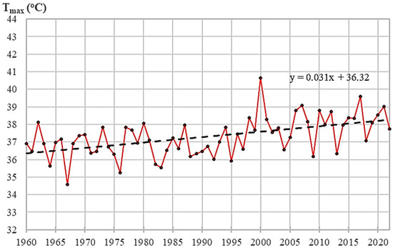 An increasing trend has been witnessed in almost all temperature trend studies conducted in various parts of the world recently. Ref. [83] recently presented a comparative trend analysis of various climate indicators in Europe and the world, examining monthly and annual data. The study reported annual mean temperature increases of 0.035 °C/year for Europe and 0.021 °C/year globally. In another study conducted for Europe, ref. [84] examined the changes in daily minimum and maximum temperatures for the Iberian Peninsula using a high resolution downscaling simulation. They used the Weather Research and Forecast (WRF) model and found an annual increase of 0.019 °C/year in maximum temperatures and 0.013 °C/year in minimum temperatures with the ERA-driven simulations. Ref. [85] investigated the change in extreme climate events in Spain between 1951 and 2021. According to the study, annual maximum temperatures have increased by 0.014 °C/year to 0.026 °C/year.