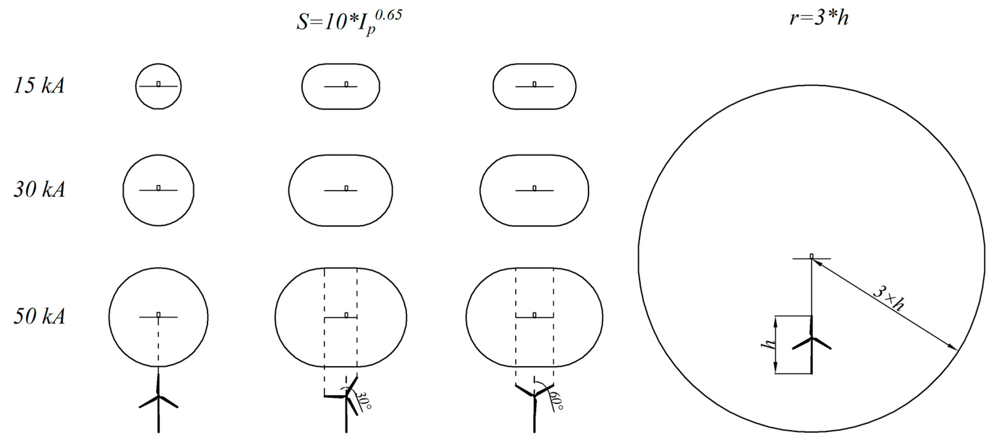 This method lacks physical significance and overestimates the equivalent collection area for tall structures by a large margin. It is merely a designed compromise solution to satisfy the lightning strike risk assessment requirements in the standard. Currently, the calculation of the equivalent collection area for wind turbines can be categorized into two types in engineering. The first type involves calculations without a physical basis. It relies on a simplified method that uses three times the turbine’s height as the equivalent radius. This makes it easier to use in engineering applications. The second type is based on strike distance and offers a calculation method for the equivalent radius depending on the wind turbine blades’ rotation angle.
