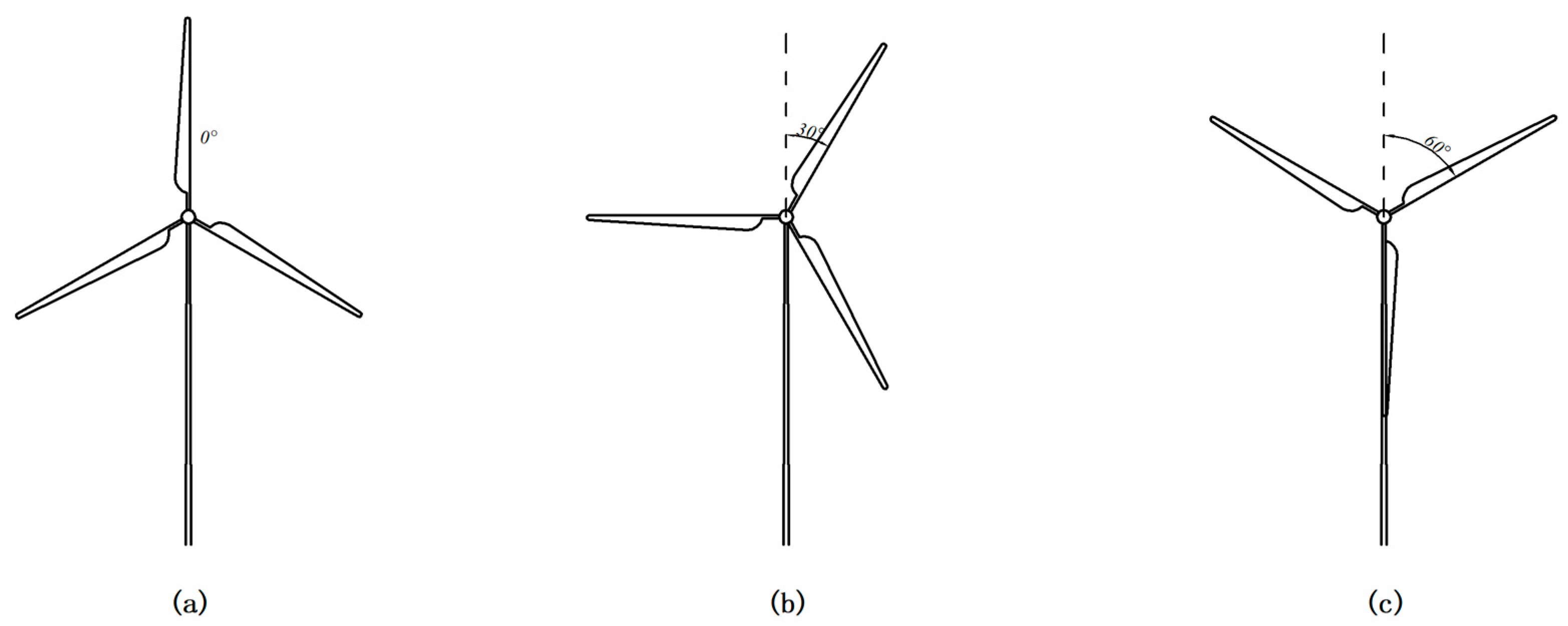 The angle distribution of wind turbine blades at (a) 0°, (b) 30°, and (c) 60°.