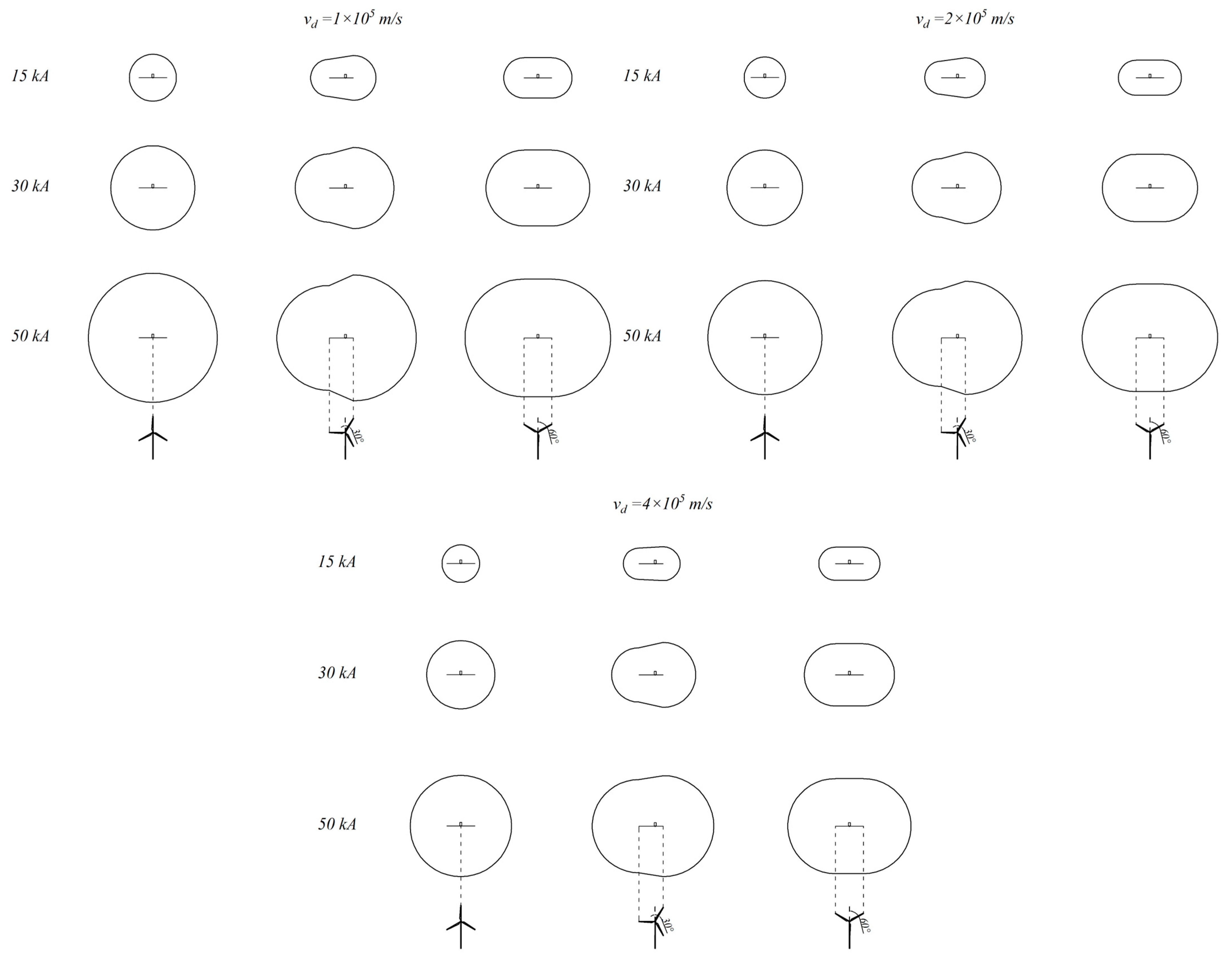 The illustration of the equivalent collection area of wind turbines under different peak current of the return stroke with stepped leader development speeds of 1 × 105 m/s, 2 × 105 m/s, and 4 × 105 m/s, respectively.