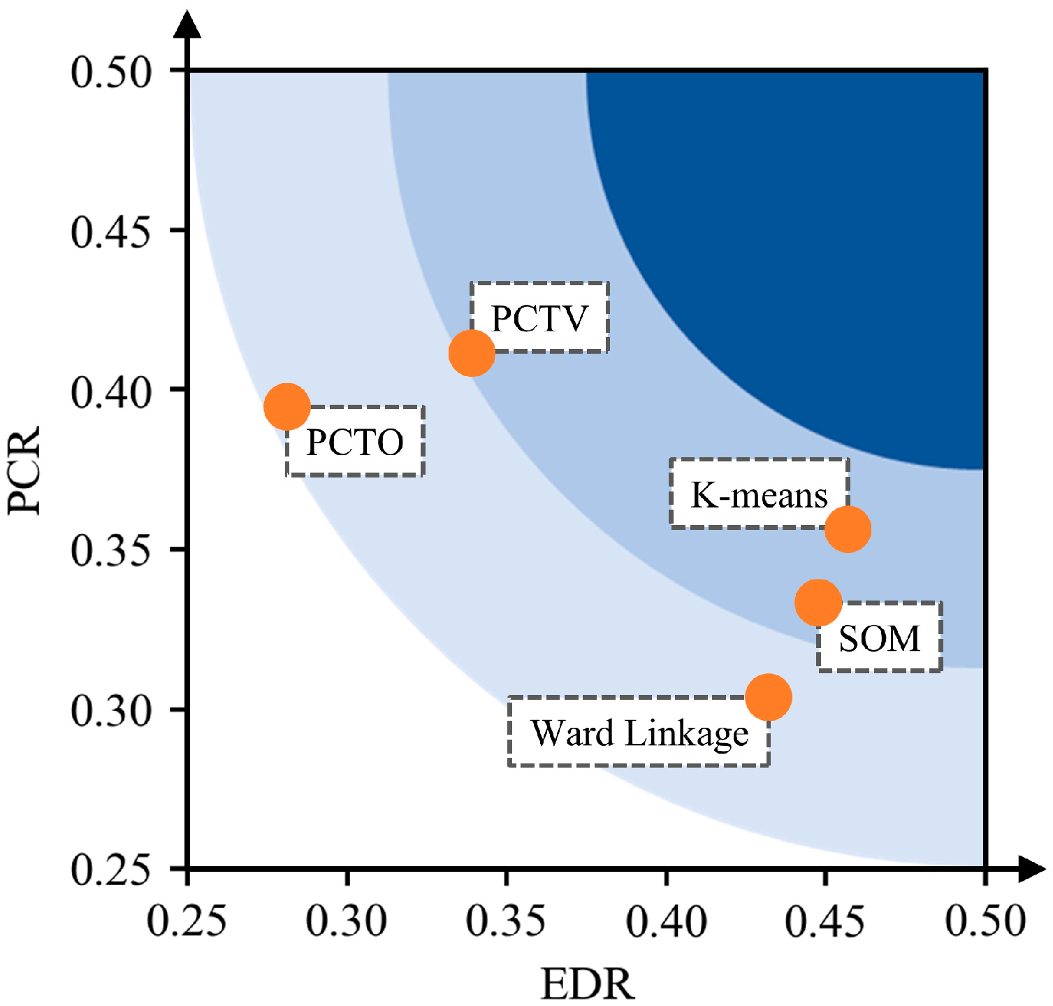 Figure 2 represent the average of 100 runs. K-means selects random samples as the initial centroids and sets a convergence threshold of 0.001 or a maximum of 300 iterations. SOM selects random samples as the initial weights for the neurons, with the initial learning rate randomly set within the range of [0.01, 0.99], and the initial neighborhood radius randomly set within the range of [1, 3], training for 10 epochs. It can be seen that both methods have similar average EDR and PCR values, but SOM has greater parameter tuning difficulty and a more complex training process. Meanwhile, K-means requires the least computational resources among the three methods.
