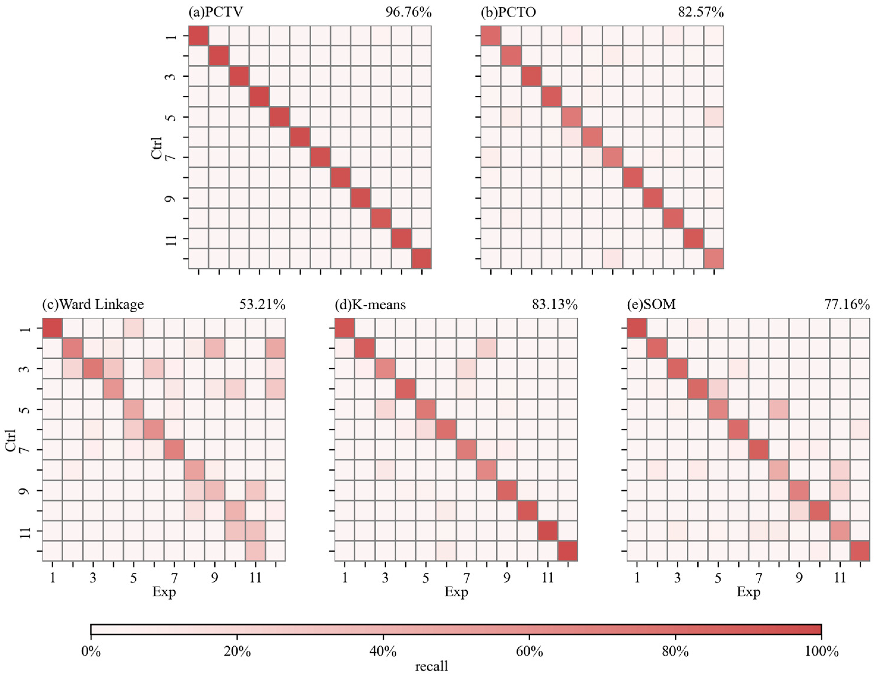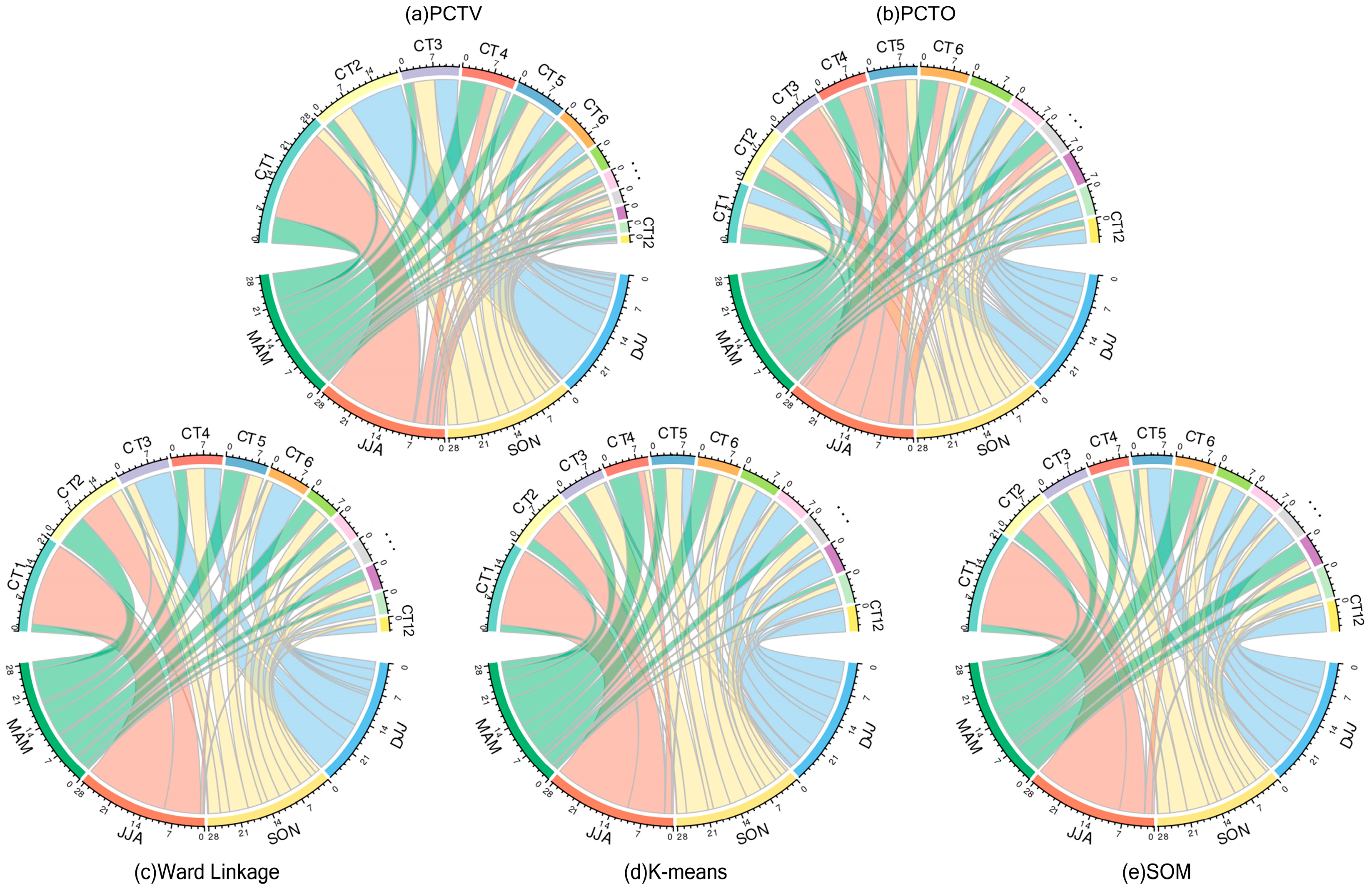 Figure 4 shows the seasonal variability of the classification results for five methods. The variability can be roughly categorized into three levels. Methods with higher variability include Ward linkage, K-means, and SOM, where the CTs in summer and winter do not overlap, and certain CTs appear only in specific seasons, showing significant seasonal variation. Next are PCT-V, where there is some overlap of CTs between winter and summer, but it still shows some seasonal variation. The methods with lower variability are PCTO, where the differences between CTs across seasons are minimal, and most CTs appear in all seasons, with the results generally being more uniform. It can be observed that classification methods based on Euclidean distance measurements are better at capturing seasonal variability compared to those based on linear relationship measurements.