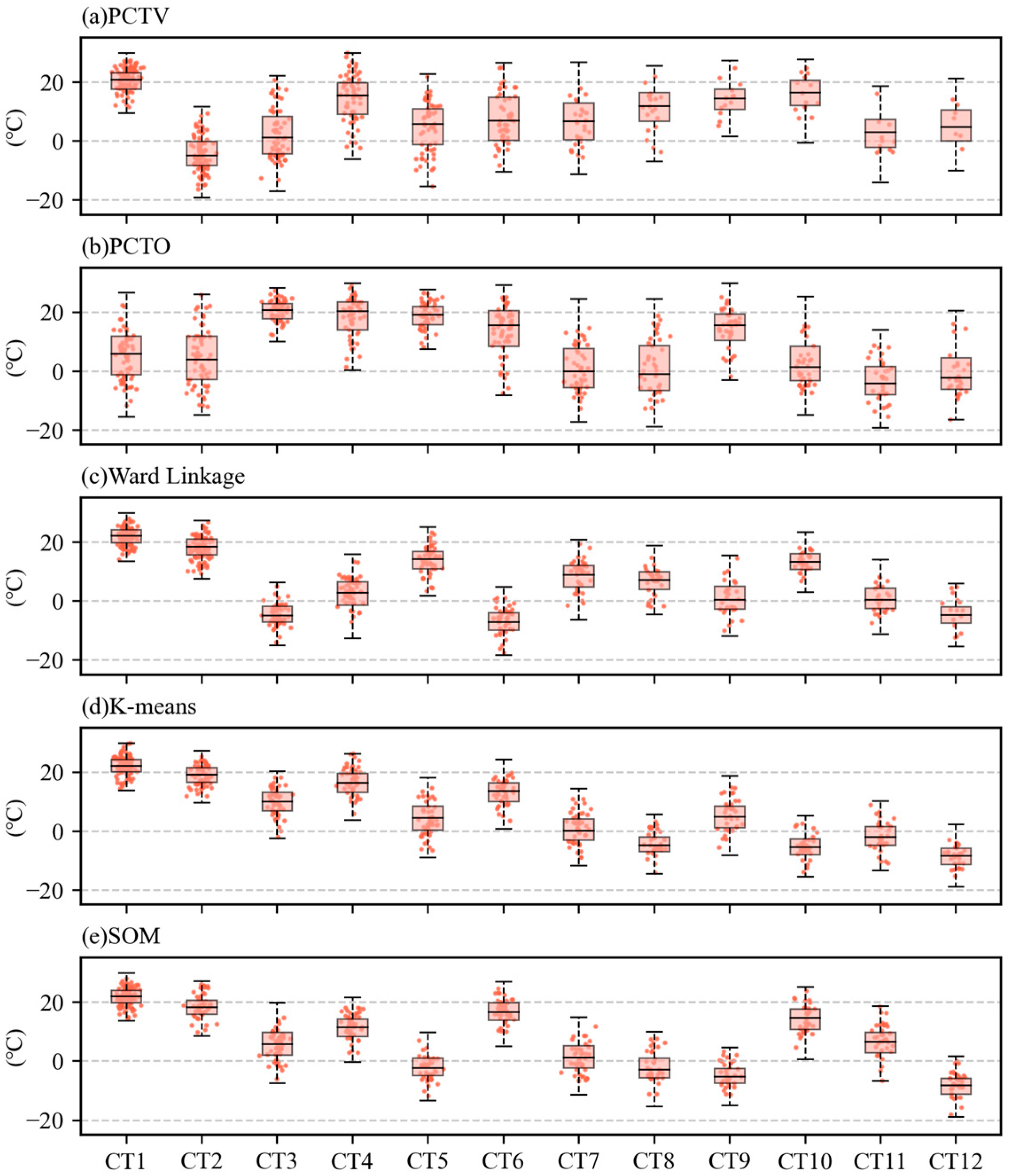 Temperature, as a sensitive variable responding to circulation patterns, often exhibits significant differences under different circulation patterns. For example, when a region is under the control of the westerlies, the temperature may be relatively mild, while in high-pressure ridge areas or surface high-pressure systems, the temperature is typically lower. By examining whether there are significant temperature differences in the CTs, we can assess the usability of the CTs.