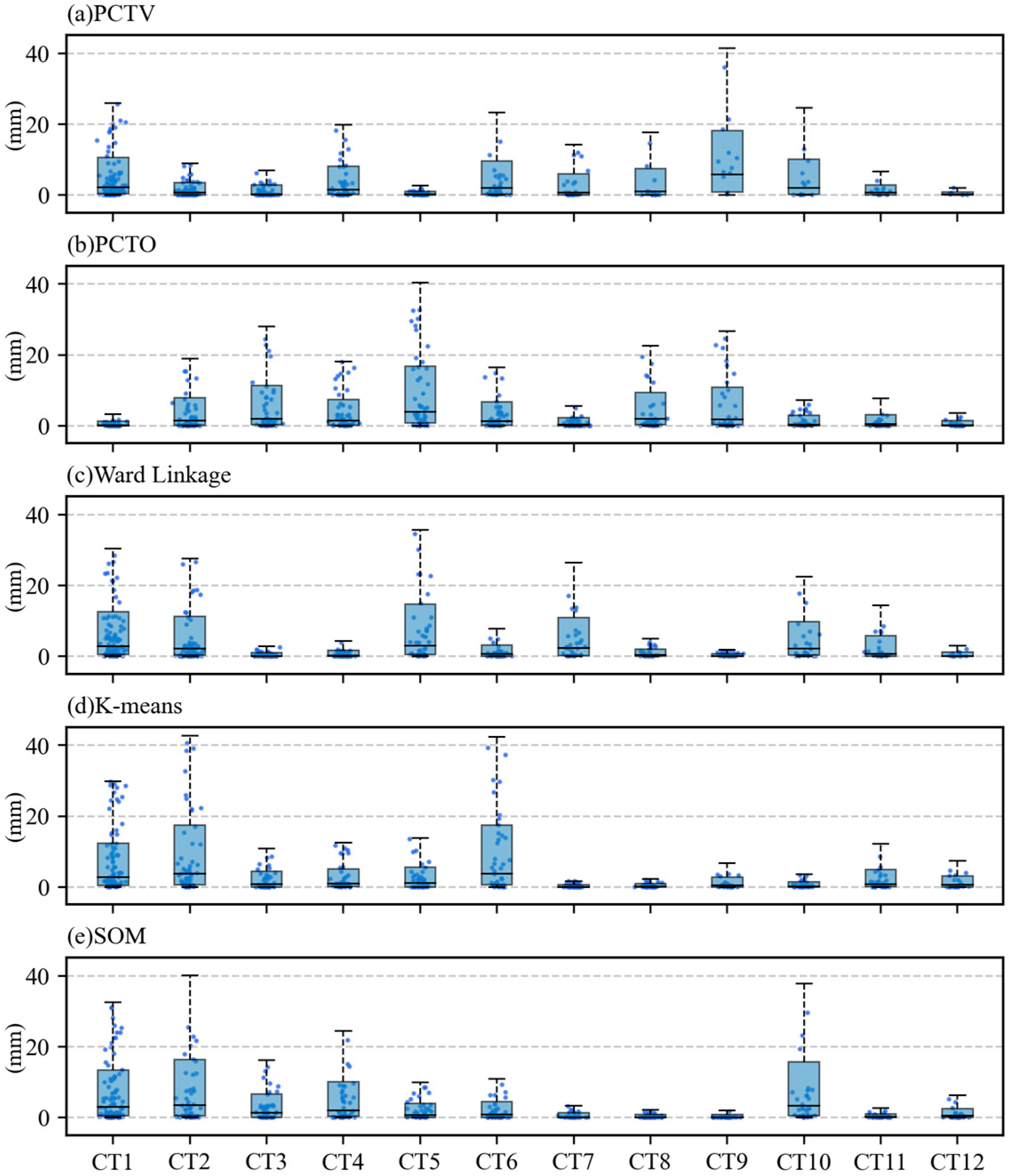 Figure 6 shows the distribution characteristics of the precipitation mean in the central region of circulation fields (36° N–39° N, 103° E–107° E) belonging to different CTs from different CTC methods. Ideal CTs should have the same characteristics as those in the temperature field. However, in practice, there is generally overlap between the boxes of all methods in the low-value region. This is because, compared to temperature, precipitation is a variable with a practical lower boundary, and this drop can be easily and commonly reached. Therefore, it is difficult to judge the effectiveness of classification methods simply based on box overlap. However, we can still assess whether the precipitation distribution under the same CT is concentrated by examining the length of the boxes. It can be observed that methods such as Ward linkage, K-means, and SOM generally have more extremely short boxes compared to methods based on PCT, indicating that these methods have better precipitation separability (at least to some extent, reflecting whether precipitation occurs).