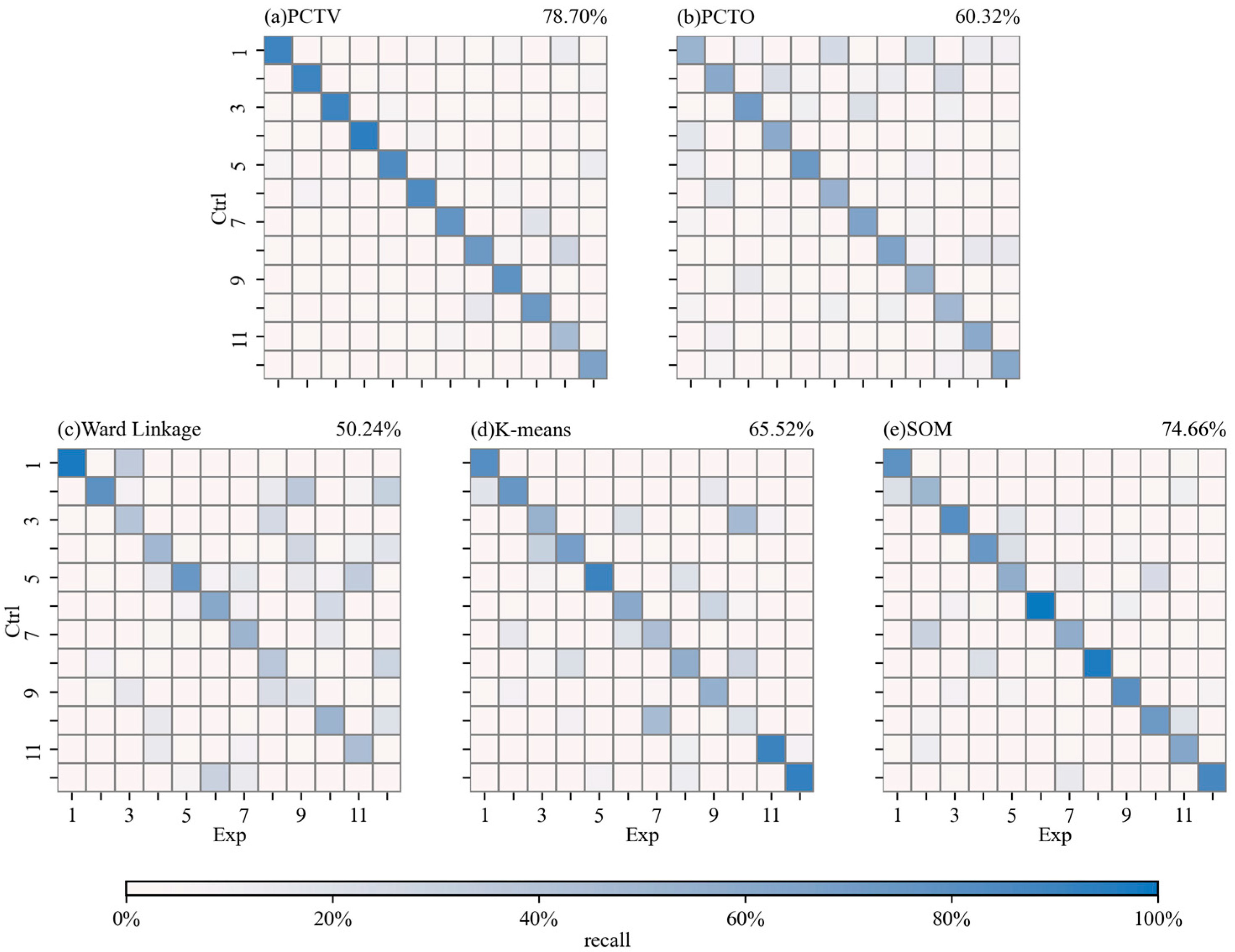 15] conducted an early and relatively comprehensive comparative study of objective CTC methods, comparing the effectiveness of five classification methods (correlation method, sums-of-squares method, average linkage, K-means, and PCT) in classifying 700 hPa geopotential heights in the European and adjacent Atlantic regions. The results showed that the CTC based on K-means clustering had stronger separability compared to other classification methods, but as the data dimensionality increased, distance metrics gradually became ineffective, making it difficult to find valid clusters, a phenomenon known as the “curse of dimensionality” [