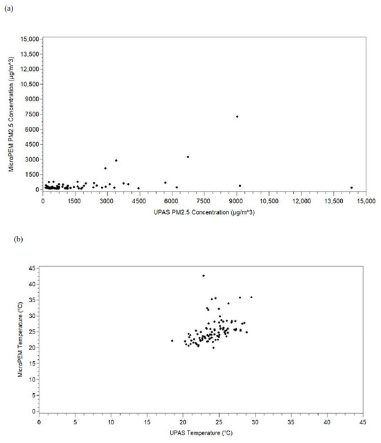Scatterplots (Figure 1) indicated positive associations between the MicroPEM and UPAS gravimetric/AM PM2.5 concentrations, temperature, and relative humidity. Scatterplots and Bland–Altman plots (Figure 2) also indicated the MicroPEM instruments usually measured lower gravimetric/AM PM2.5 concentrations (panel [a] in Figure 1 and Figure 2), similar temperatures with some exceptions in which the MicroPEM instruments measured higher temperatures (panel [b] in Figure 1 and Figure 2), and higher relative humidities (panel [c] in Figure 1 and Figure 2) compared to the UPAS instruments. However, the percentages of measurements within the 95% limits of agreement in the Bland–Altman plots were approximately equal to the expected 95% for the gravimetric/AM PM2.5 concentrations (96%), temperature (96%), and relative humidity (96%).