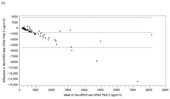 For the MicroPEM and UPAS gravimetric/AM PM2.5 concentrations, temperature, and relative humidity and their differences, the authors calculated the numbers of missing and non-missing samples, AMs, SDs, minimums, first quartiles, medians, third quartiles, and maximums. For the differences, the authors calculated the AMs, 95% confidence intervals (CI), and p-values via intercept-only linear regression models that used the original values as the outcomes. The distributions of the differences for the PM2.5 concentrations and temperature were not approximately normal, so the authors also calculated the medians, 95% CIs, and p-values via intercept-only quantile regression models that used the original values as the outcomes. The authors also calculated Pearson’s (PCC), Spearman’s (SCC), and the concordance correlation coefficients (CCC) [44] for associations between the MicroPEM and UPAS PM2.5 concentrations, temperature, and relative humidity. The authors made scatterplots and Bland–Altman plots [45,46] to compare the MicroPEM and UPAS PM2.5 concentrations, temperature, and relative humidity. The authors also conducted two sensitivity analyses (Supplemental Materials, p. 4).