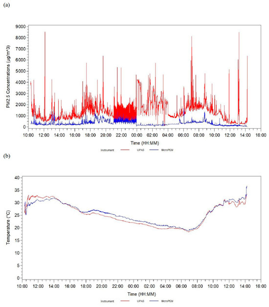 The AM sampling time was 21.43 (SD: 2.28) hours. The median gravimetric/AM PM2.5 concentrations measured by the MicroPEM and UPAS instruments were 207.06 (interquartile range [IQR]: 216.24) and 737.74 (IQR: 1399.98) µg/m3, respectively, and the median difference was −553.35 (IQR: 1077.98) µg/m3 (Table 1). The median temperatures measured by the MicroPEM and UPAS instruments were 24.86 (IQR: 3.86) and 24.00 (IQR: 3.17) °C, respectively, and the median difference was 0.39 (IQR: 3.26) °C. The AM relative humidities measured by the MicroPEM and UPAS instruments were 43.67 (SD: 8.71) and 34.23 (SD: 5.00) %, respectively, and the median difference was 9.69 (SD: 6.87) %.