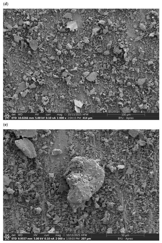 Electron micrographs of 25 and 37mm filters. Panels (a–c) show particles on a 25 mm filter from a MicroPEM worn by a male red/green brick carrier at 1000x 2000x, and 10,000x magnifications, respectively. Panels (d–f) show particles on a 37 mm filter from UPAS worn by a male red/green brick carrier at 1000x, 2000x, and 10,000x magnifications, respectively. Electron micrographs by Michael Standing, Brigham Young University Electron Microscope Facility.
