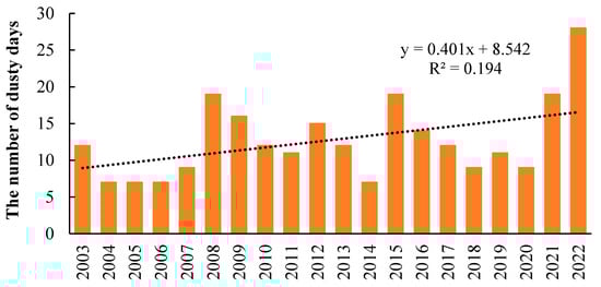 Annual variation in the number of dusty days in Yazd Province from 2003 to 2022.