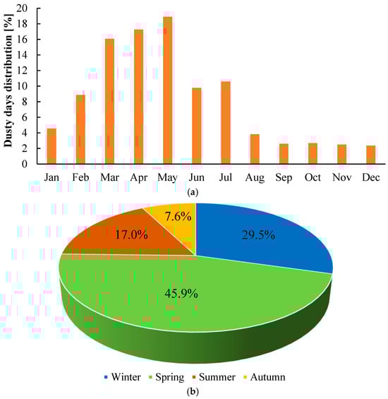 The average monthly (a) and seasonal (b) distribution of dusty days in Yazd province during 2003–2022.