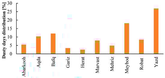 The percentage distribution of the number of dusty days across synoptical stations in Yazd province during 2003–2022.