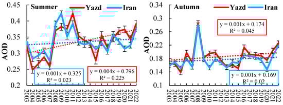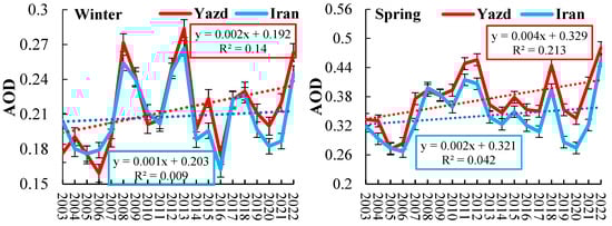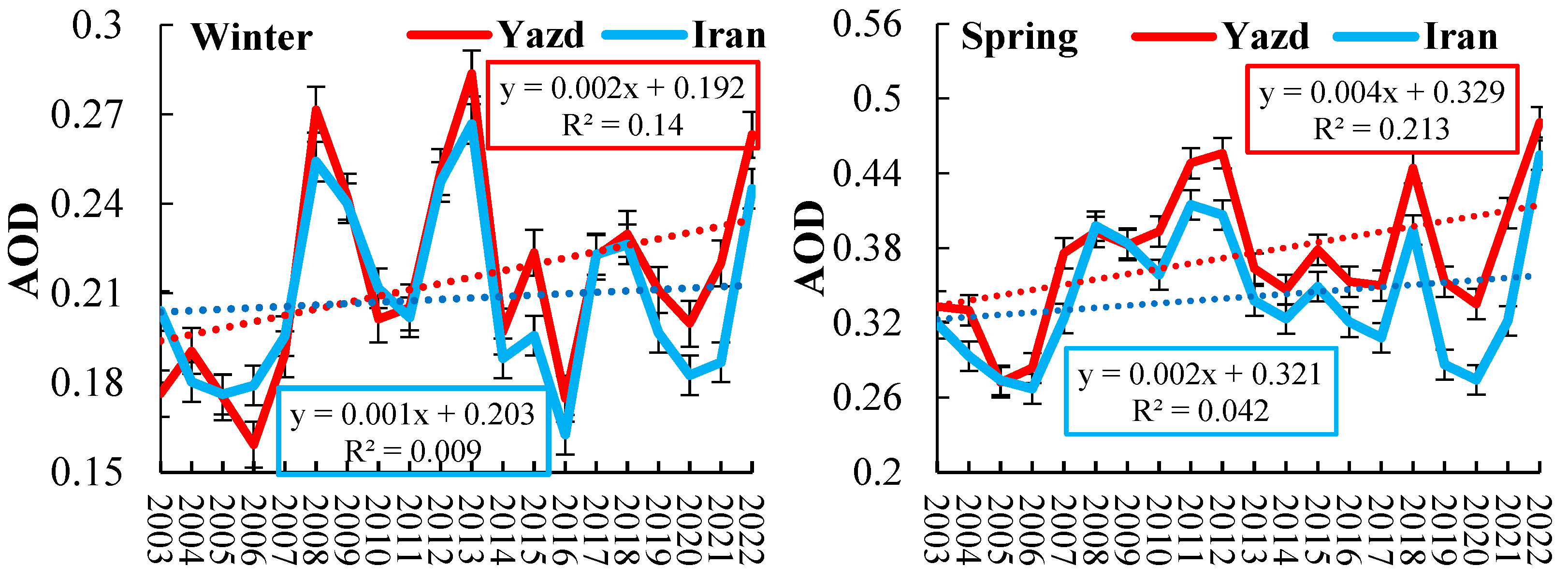 Seasonal variations of annual mean Aerosol Optical Depth (AOD) over Iran (blue line) and Yazd Province (red line) during 2003–2022.