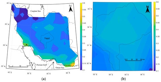 The spatial distribution of the mean AOD during 2003–2022 for Iran (a) and Yazd province (b).