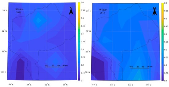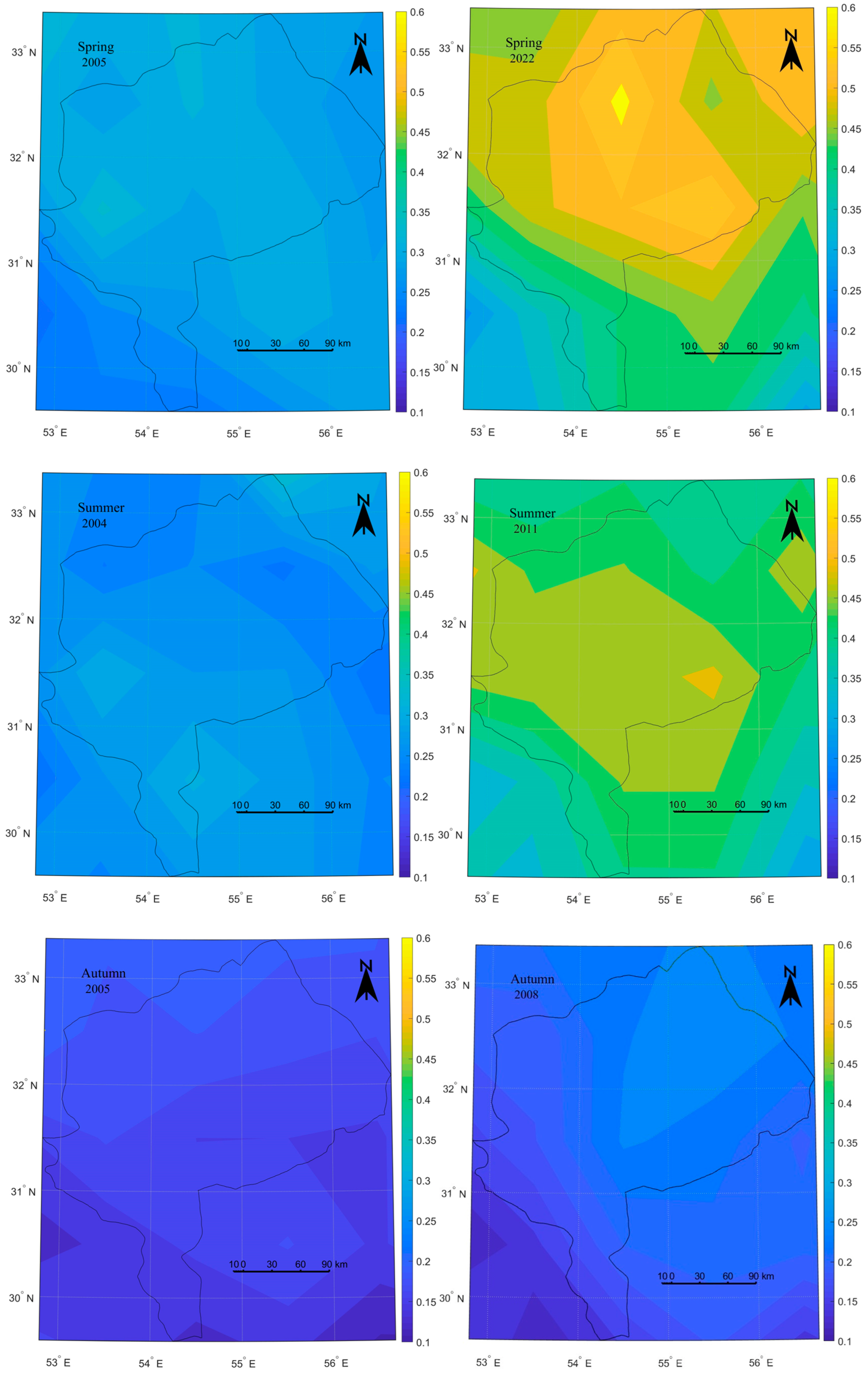 To provide a more comprehensive analysis, the periods with the highest and lowest Aerosol Optical Depth (AOD) values were selected for each season, and spatial distribution maps were generated for the corresponding years (Figure 11). In winter, the lowest and highest AOD values were recorded in 2006 and 2013, respectively, with values of 0.16 and 0.28. For spring, the minimum and maximum AOD values occurred in 2005 and 2022, with values of 0.27 and 0.48. Summer exhibited its lowest and highest AOD values in 2004 and 2022, corresponding to 0.24 and 0.39, respectively. In autumn, the minimum and maximum AOD values were observed in 2005 and 2008, with values of 0.14 and 0.29. The highest AOD values were generally observed during the spring and summer seasons. Notably, the minimum AOD values in these warmer seasons were even higher than the maximum values recorded in winter and autumn. These findings indicate that aerosol impacts on air quality are most pronounced during the warmer months. Further research is therefore needed to better understand the factors driving the seasonal variability of AOD.