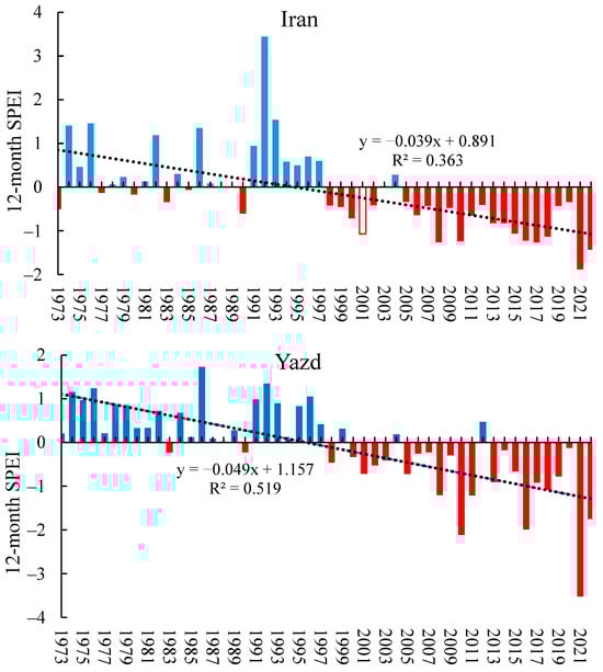 Time series of 12-month SPEIs in Iran and Yazd Province during 1973–2022.