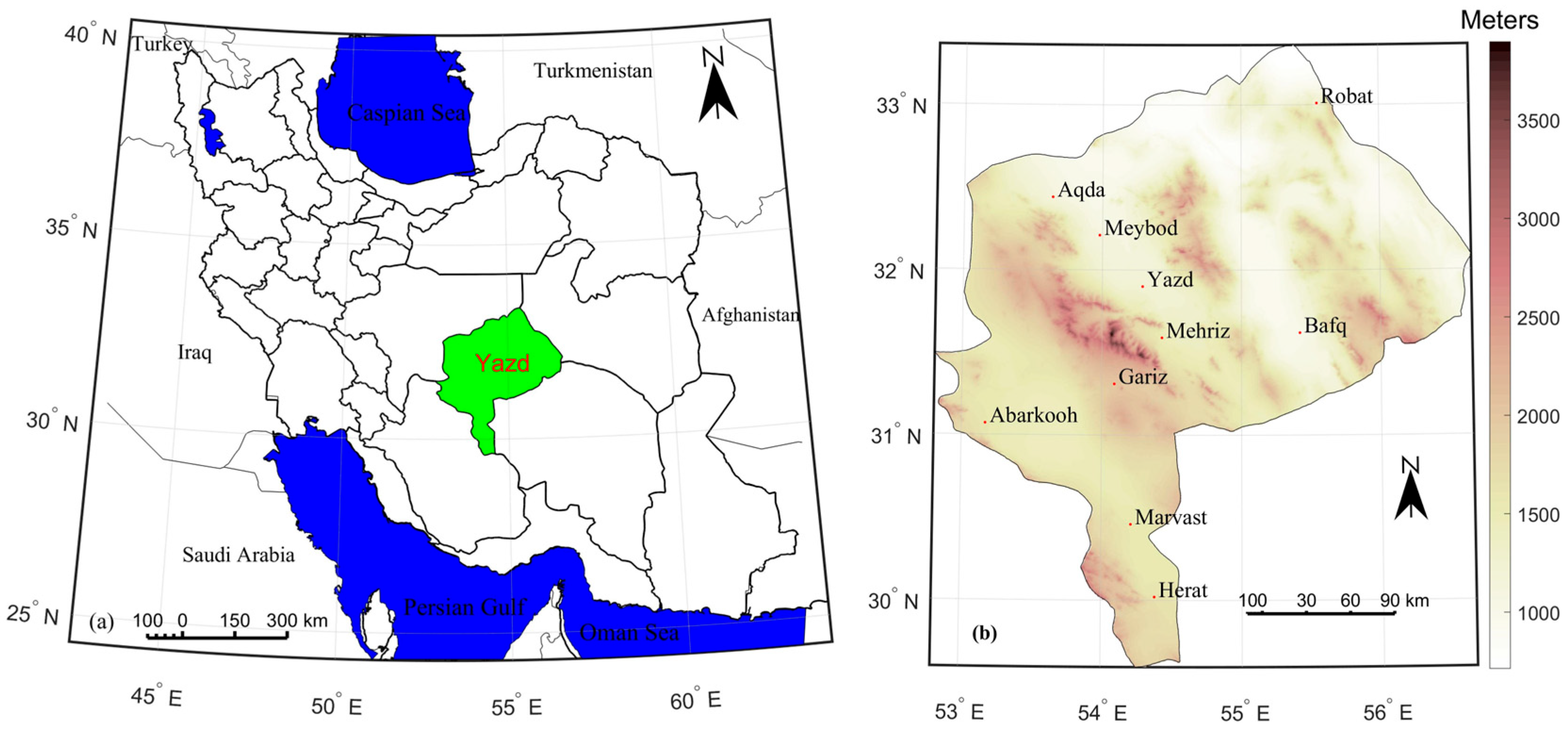 The geographical location of Yazd province in Iran (a), and digital elevation model (DEM) map of the Yazd province with the synoptical stations’ location marked by red dots (b).